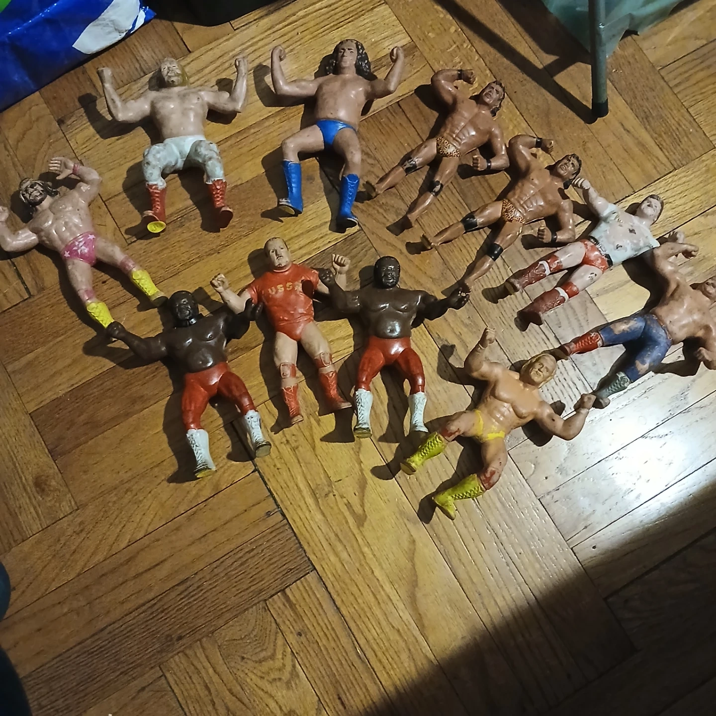 Selling a collection of vintage wrestling action figures. These figures show signs of wear from play and age, but they're still great for collectors or fans of classic wrestling! Complete set must be purchased .