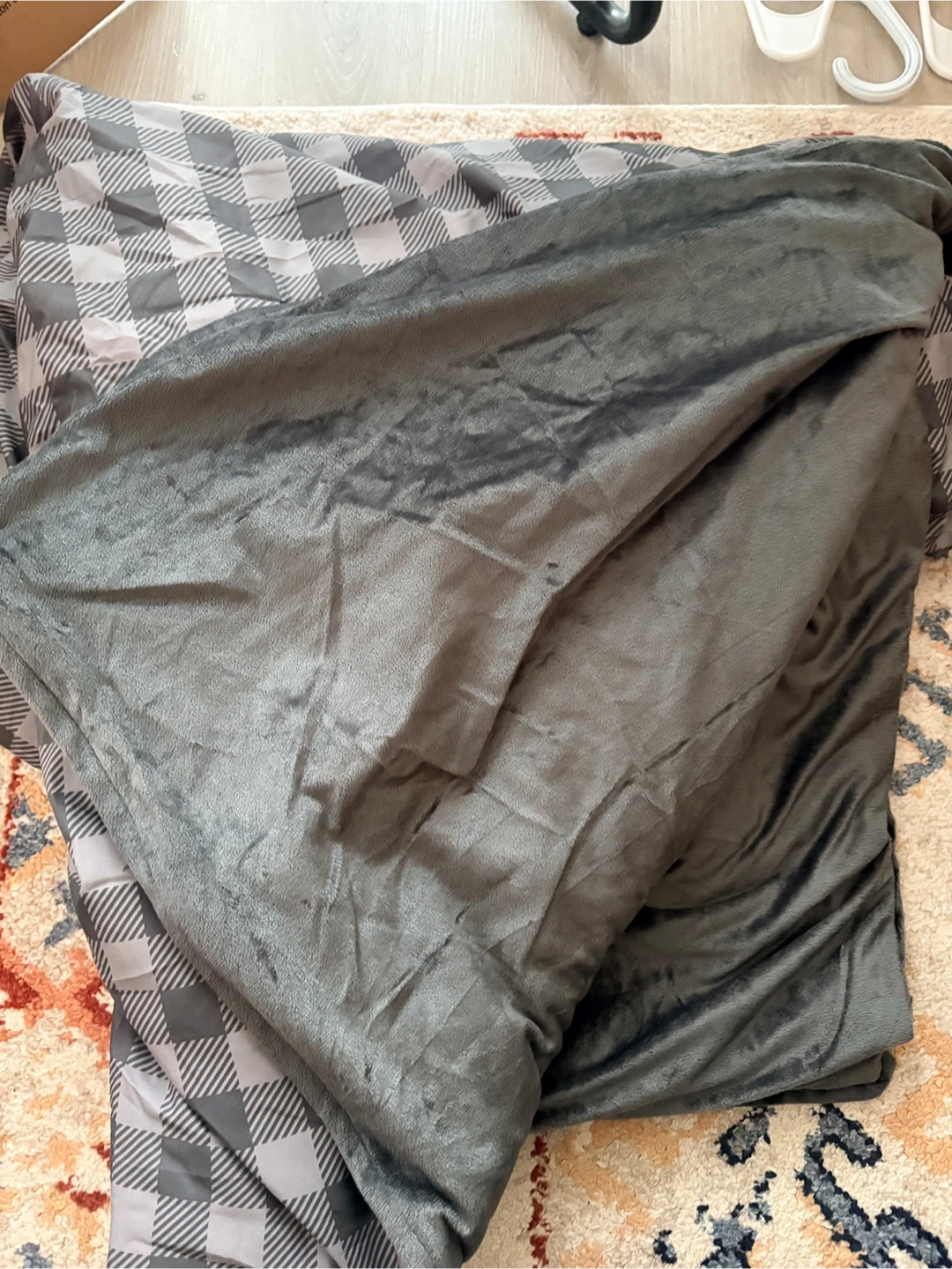 A cozy grey weighted blanket, perfect for adding a touch of warmth to your home. It has a soft texture that makes it ideal for snuggling up on the couch. The blanket is in good condition and ready to be used