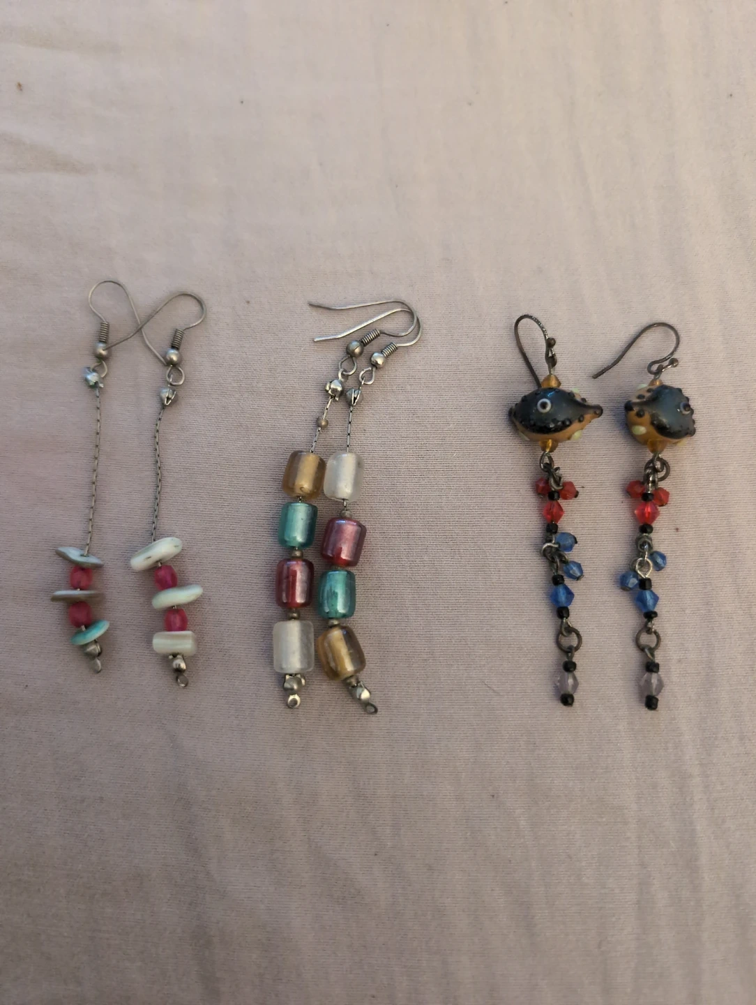 Check out these unique, handmade beaded earrings! There are three different styles, each with its own charm. They're perfect for adding a pop of colour and personality to any outfit. They are in great condition and ready for a new owner!