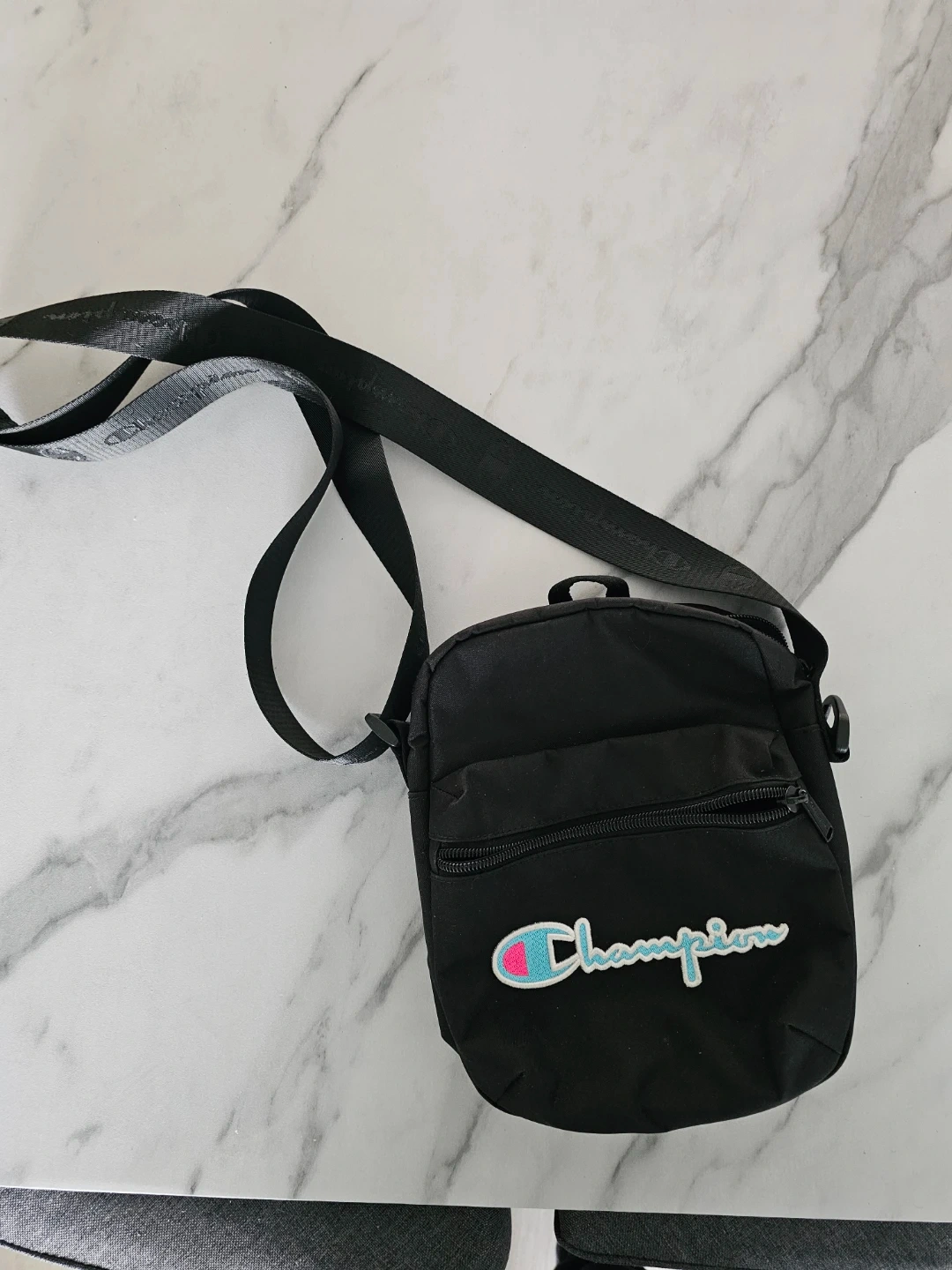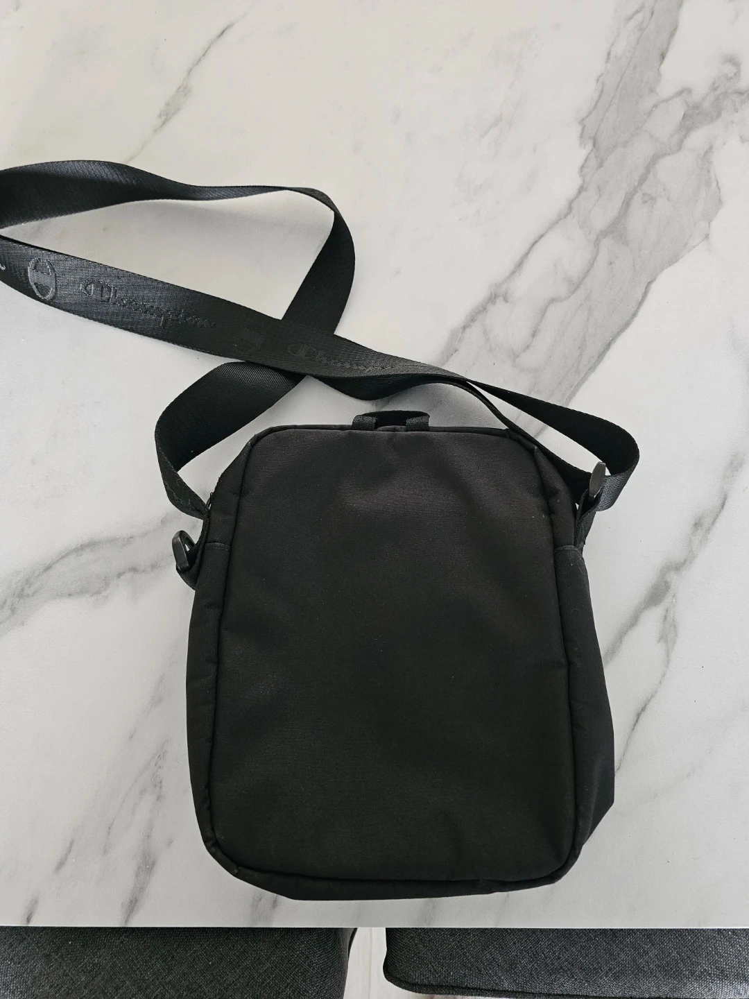 Here's a Champion black crossbody bag! It's in great shape and ready for a new owner. Perfect for carrying your essentials on the go