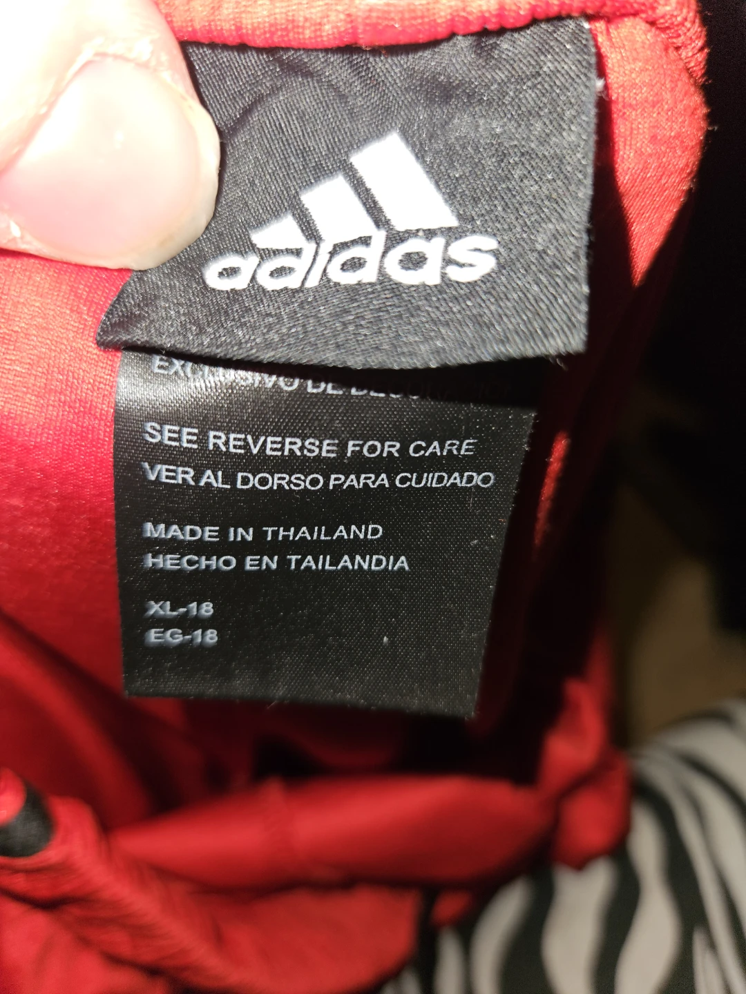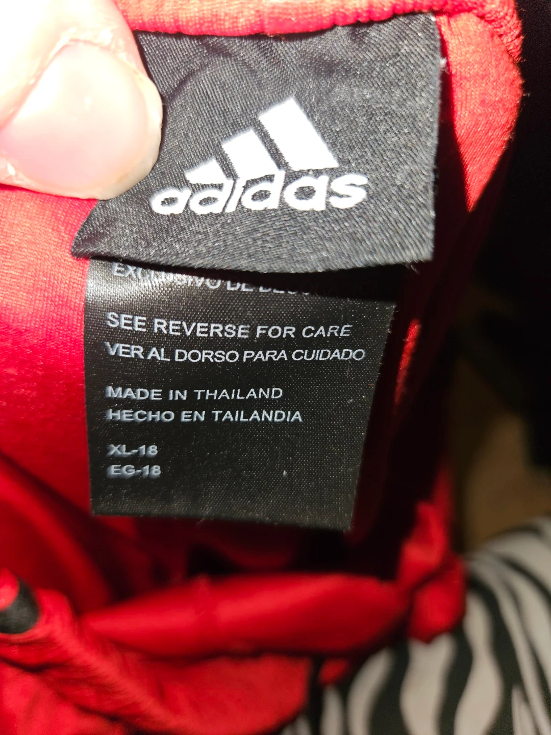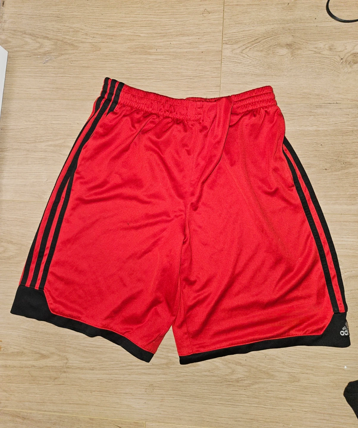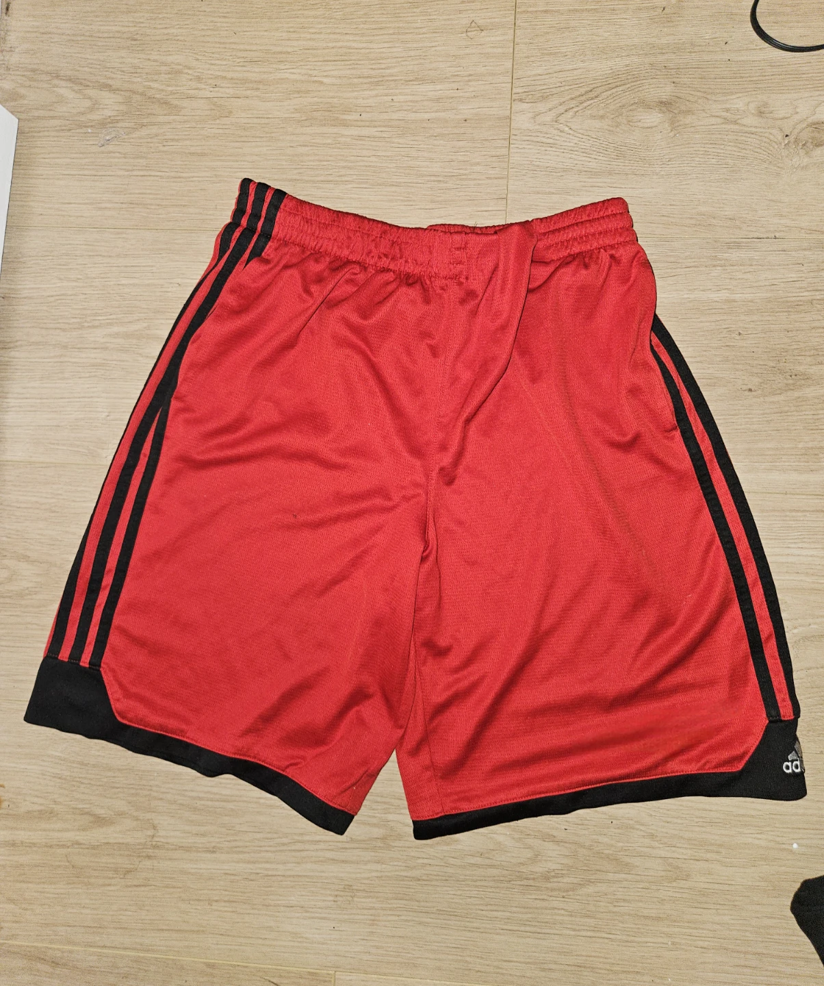 Here are some Adidas basketball shorts in excellent condition! They're a vibrant red with black accents and the classic three stripes down the sides. Size XL
