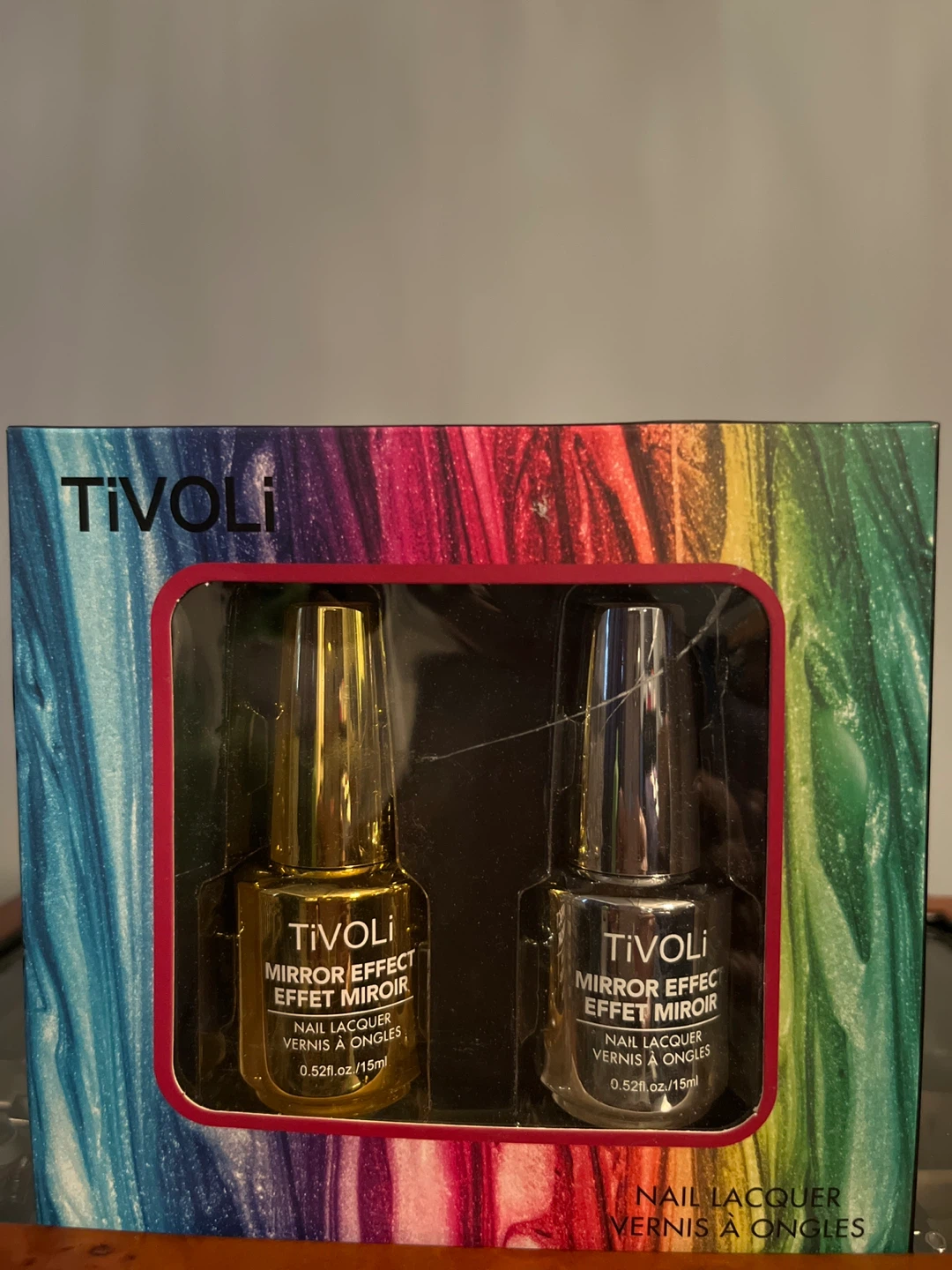 Selling a brand new set of Tivoli Mirror Effect nail lacquer! The set includes two bottles, each 0.52 fl oz/15ml, in gold and silver shades. Perfect for creating a mirror-like finish on your nails!