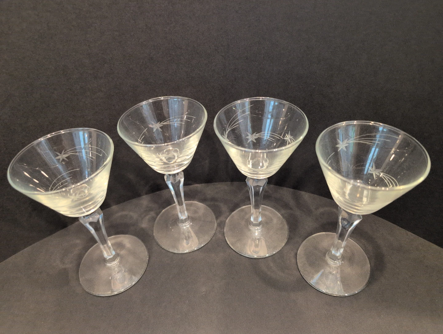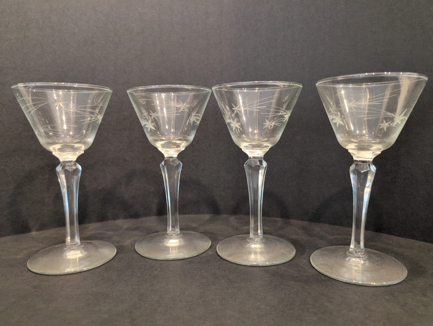 Selling a set of four vintage tall sherbet/champagne glasses. They feature a delicate starburst etched design. Perfect for your next cocktail night! Beautiful condition, no chips, no cracks. 6.5" tall, 3" diameter.