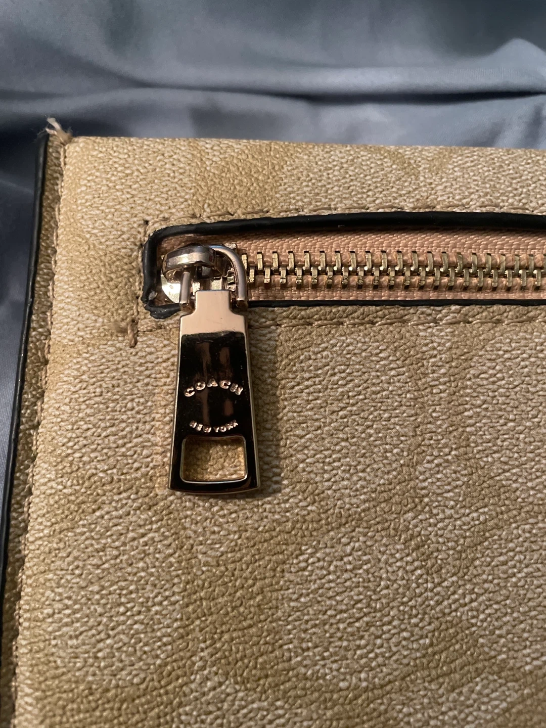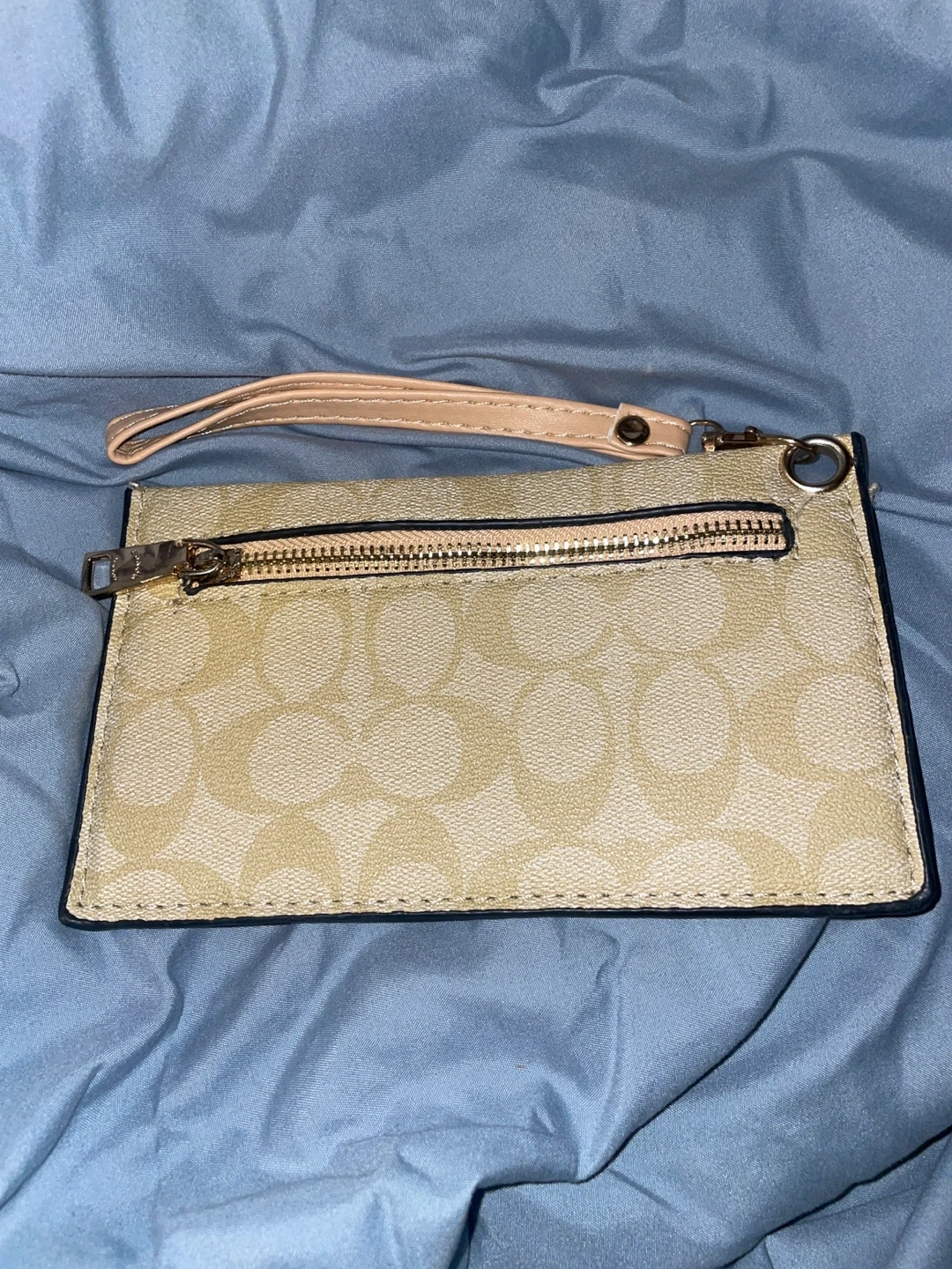 Selling a Coach wristlet in good condition. It features a beige colour with the brand's logo pattern. It has a zipper closure and a wrist strap.