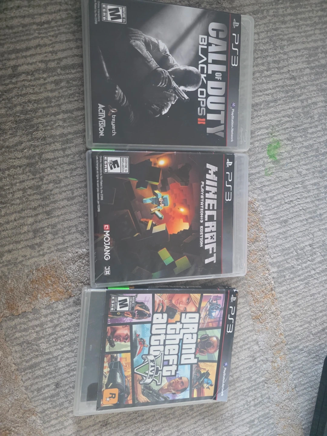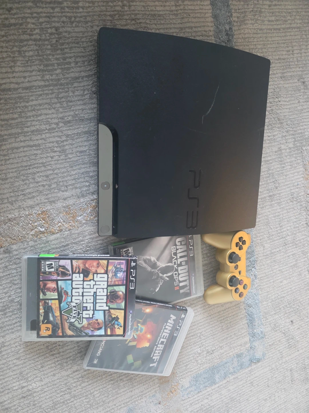 Selling a PlayStation 3 console with a gold controller and a few games. Includes Grand Theft Auto V, Call of Duty Black Ops II, and Minecraft PlayStation 3 Edition. Great for some retro gaming!