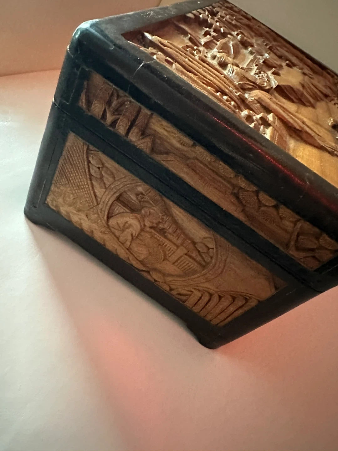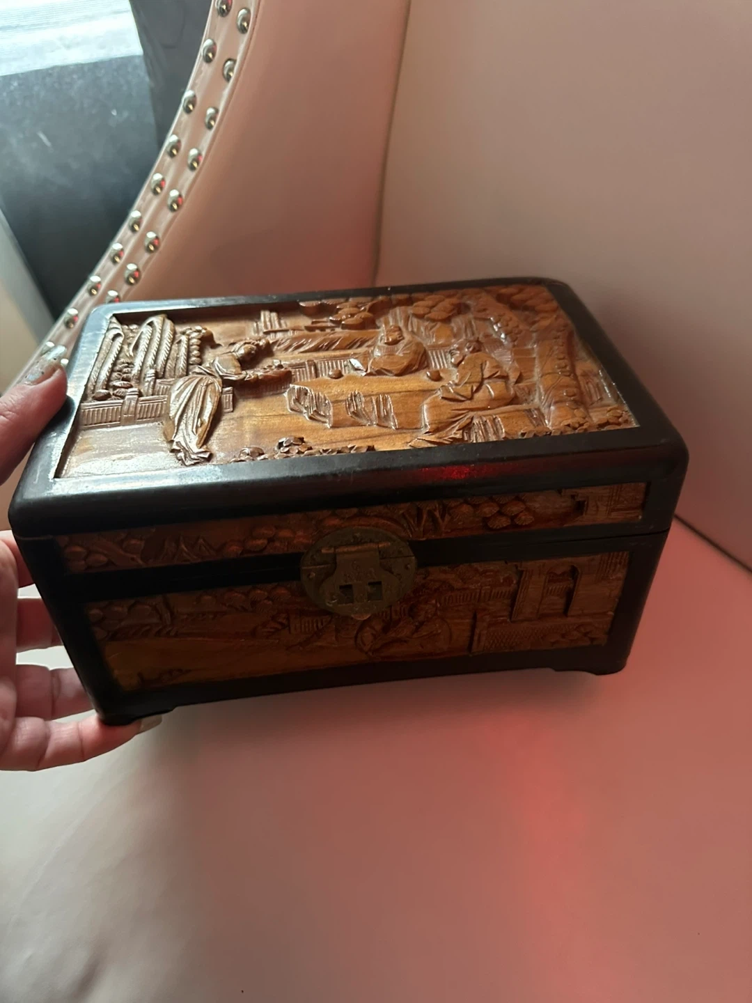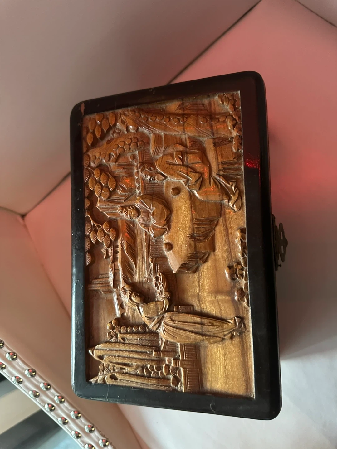 Selling a unique vintage carved wooden box! It has a beautiful, detailed design on all sides and a clasp closure. It would be perfect for storing jewelry or other small treasures. The box is in good condition, with some signs of wear adding to its vintage charm