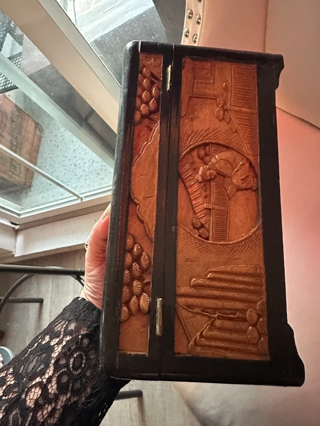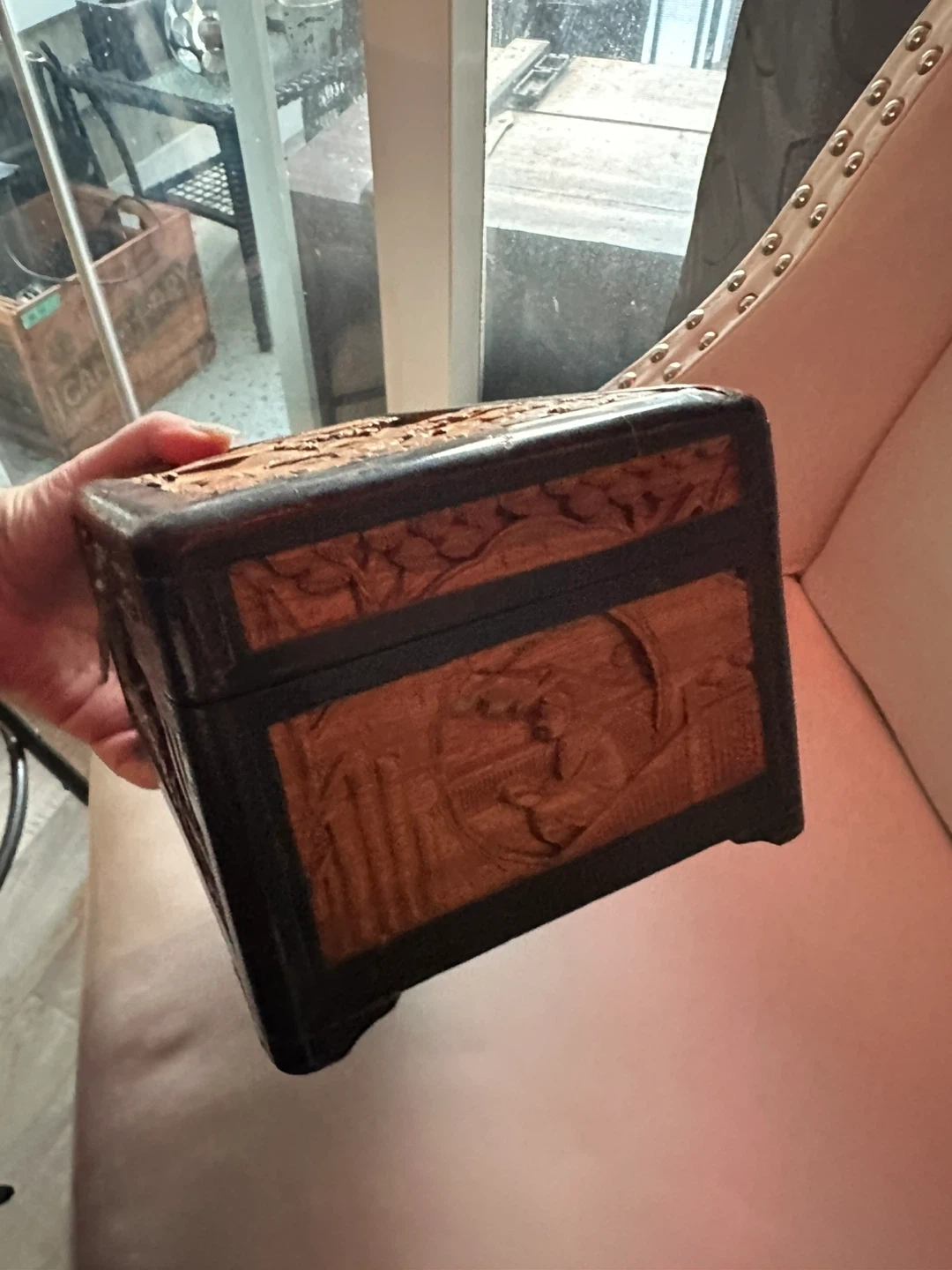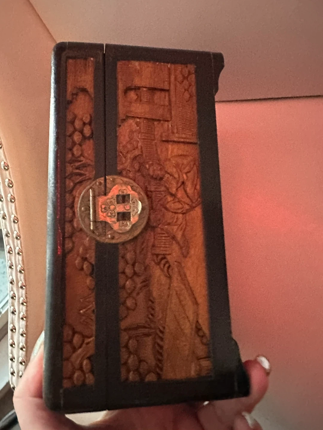Selling a unique vintage carved wooden box! It has a beautiful, detailed design on all sides and a clasp closure. It would be perfect for storing jewelry or other small treasures. The box is in good condition, with some signs of wear adding to its vintage charm