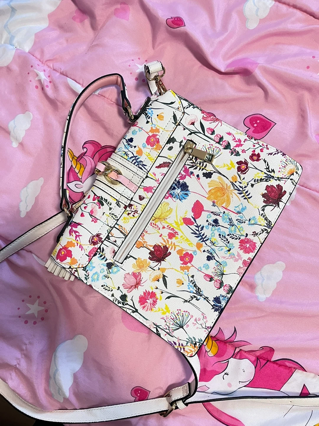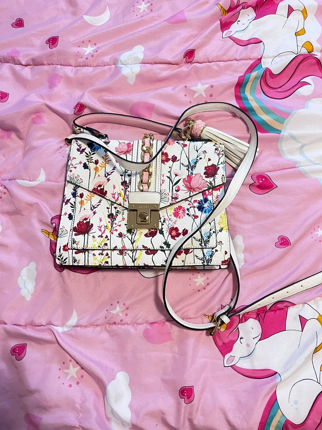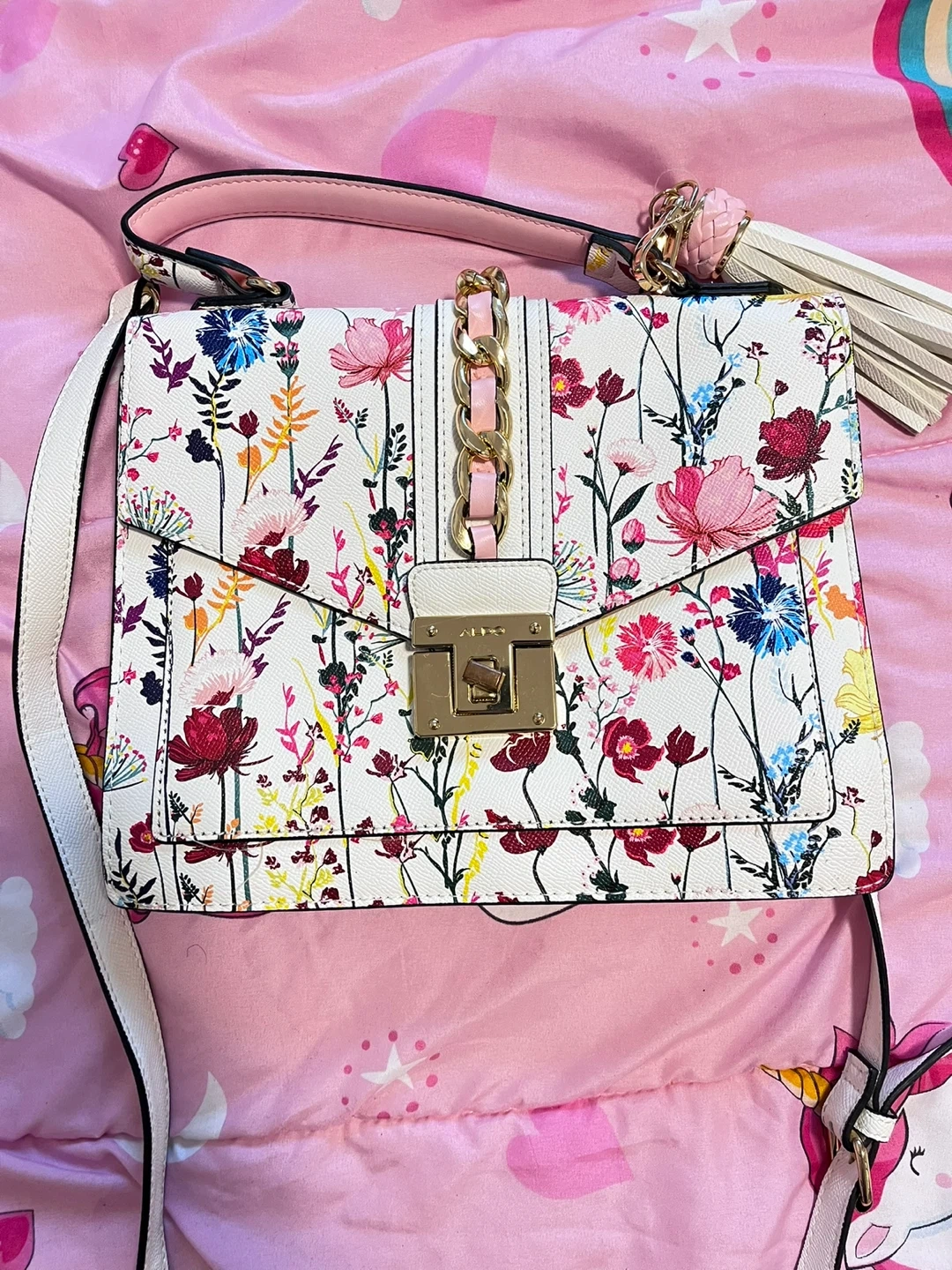 Selling a cute ALDO crossbody bag with a floral print! It's in great condition and perfect for adding a pop of colour to any outfit. The bag has a long strap and a top handle, plus a fun tassel detail. It’s a stylish and practical accessory! I used it once but it’s like new and in great condition