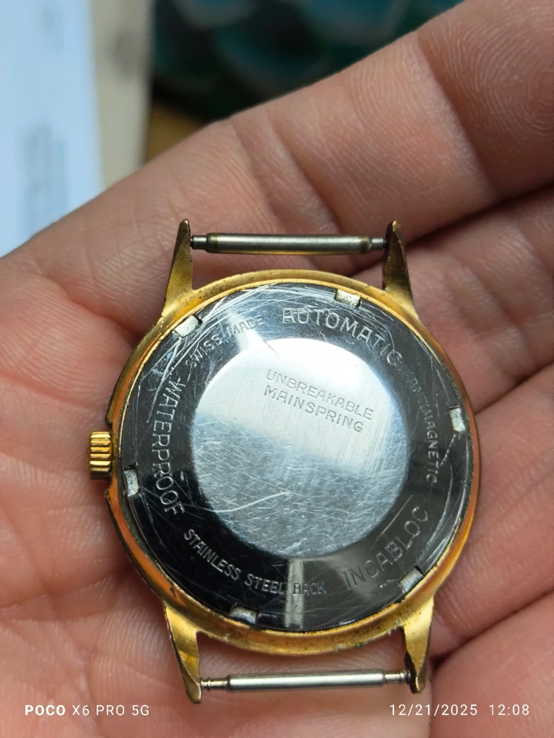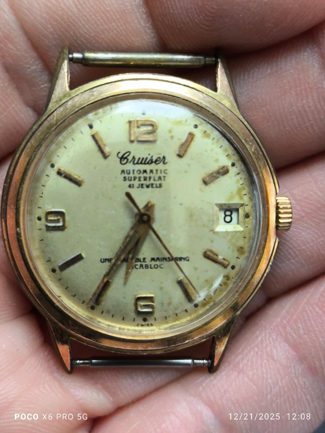 Selling a vintage Cruiser automatic watch. It's a superflat model with 41 jewels. The watch has an unbreakable mainspring and is marked as waterproof with a stainless steel back. The back also indicates it's Swiss made and has Incabloc shock protection. It shows some signs of wear but could be a great find for a collector!