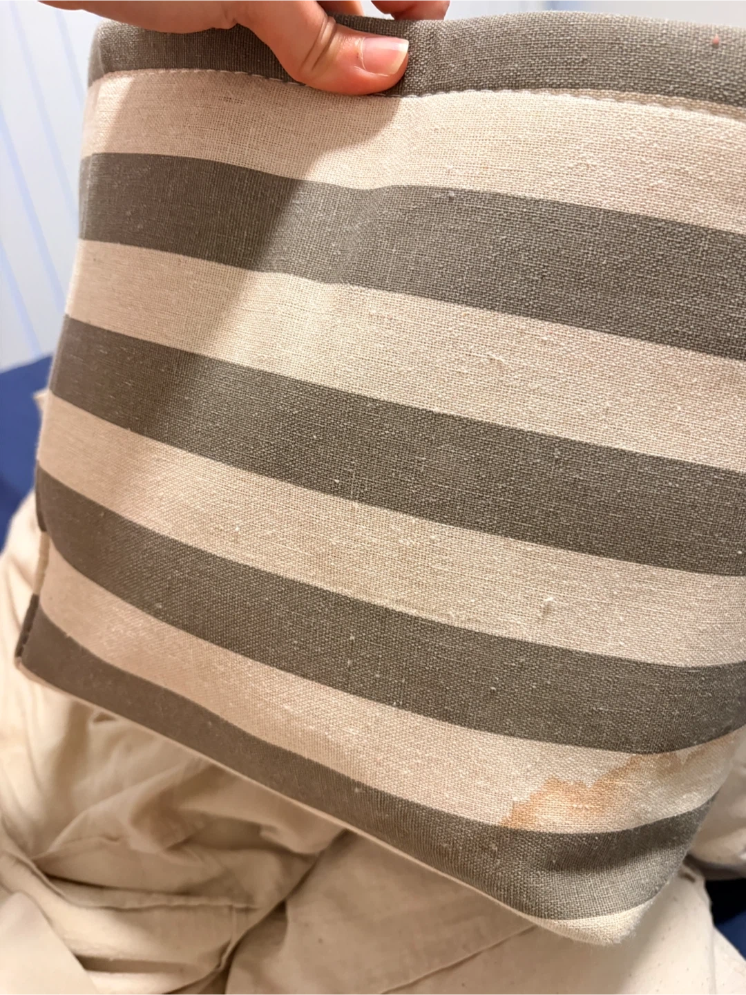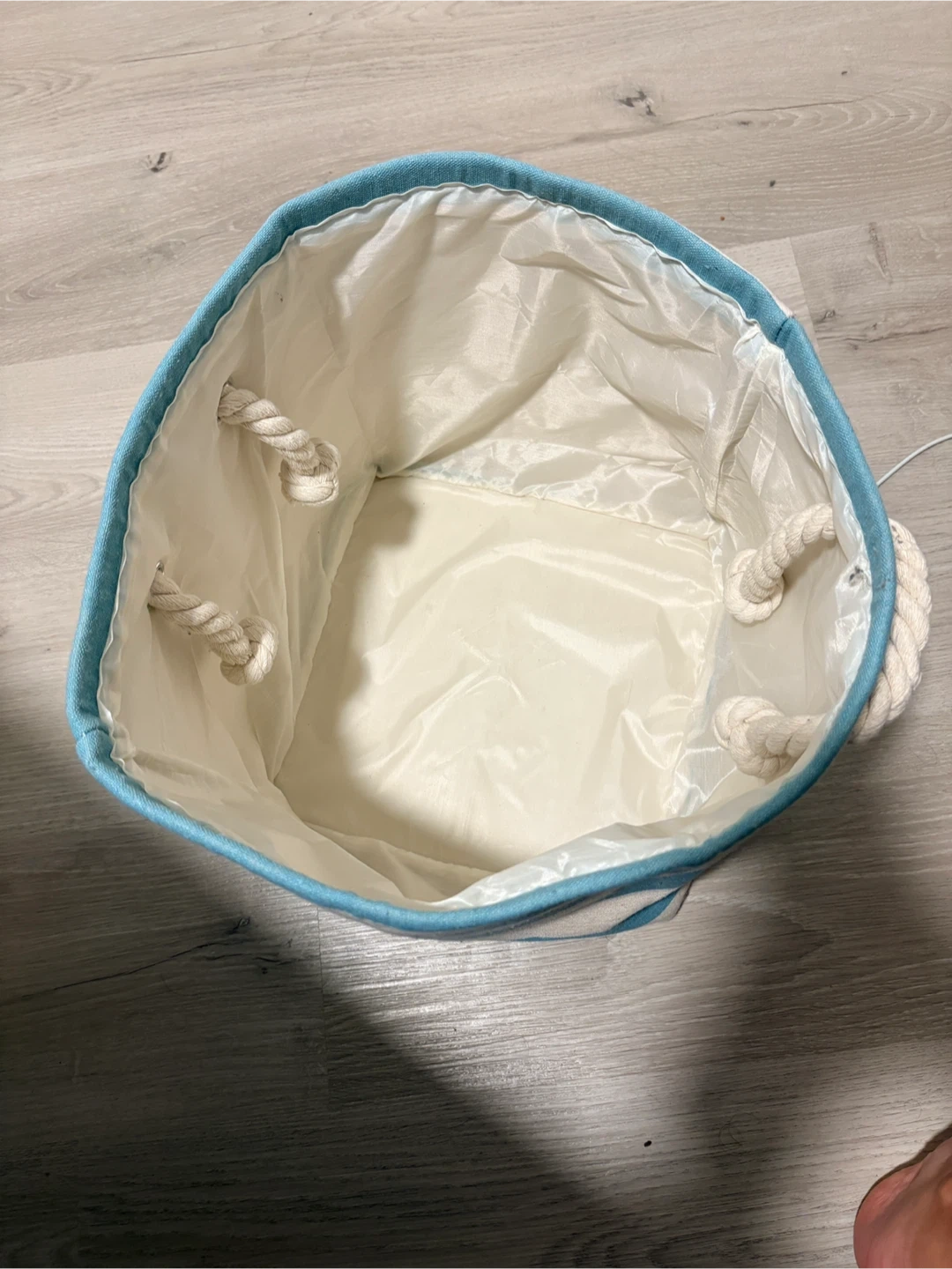 Check out this handy striped storage bin! It's got rope handles, making it easy to carry around. Perfect for organizing toys, laundry, or anything else you need to keep tidy. There is a stain on the side of the bin.