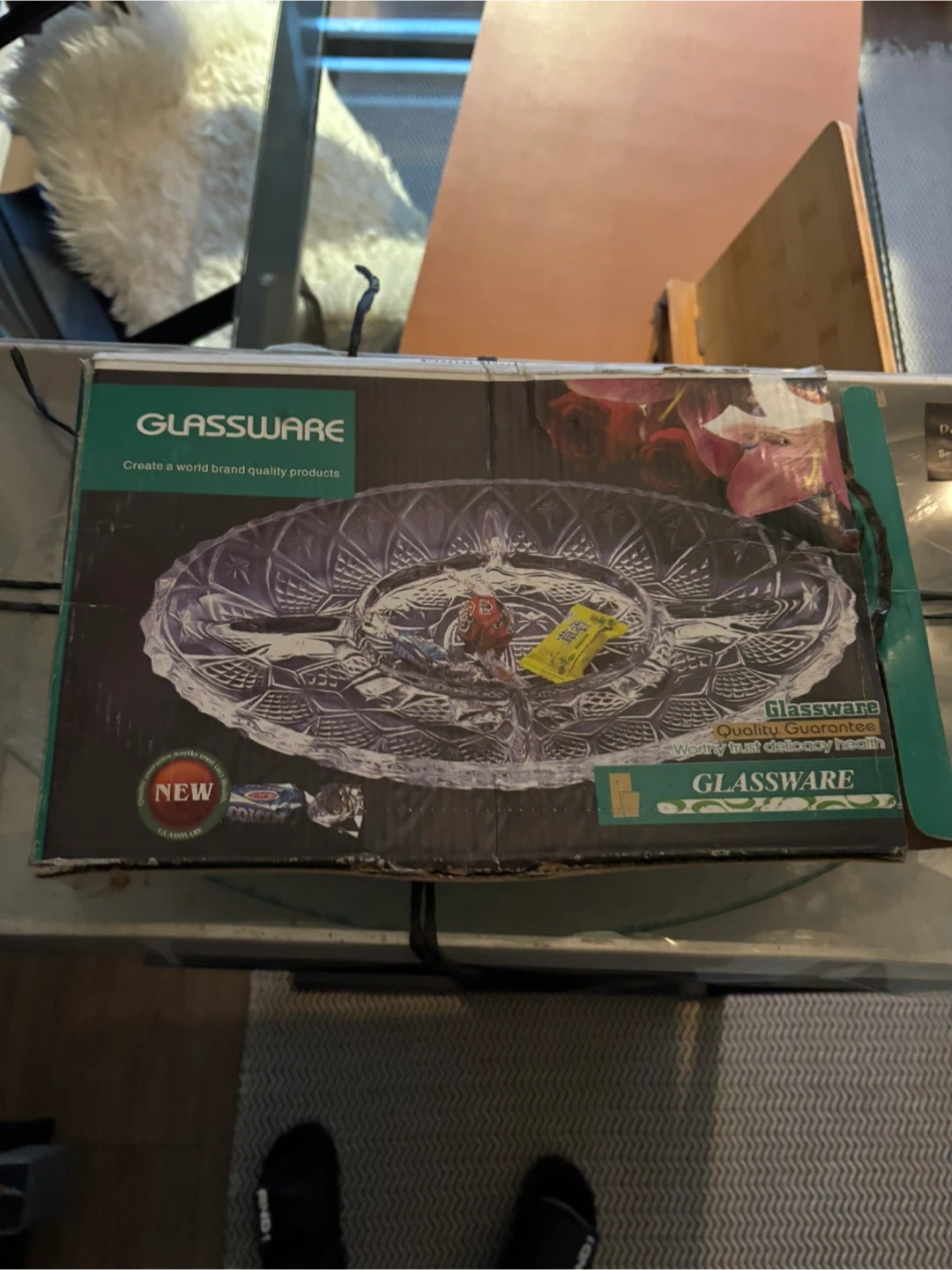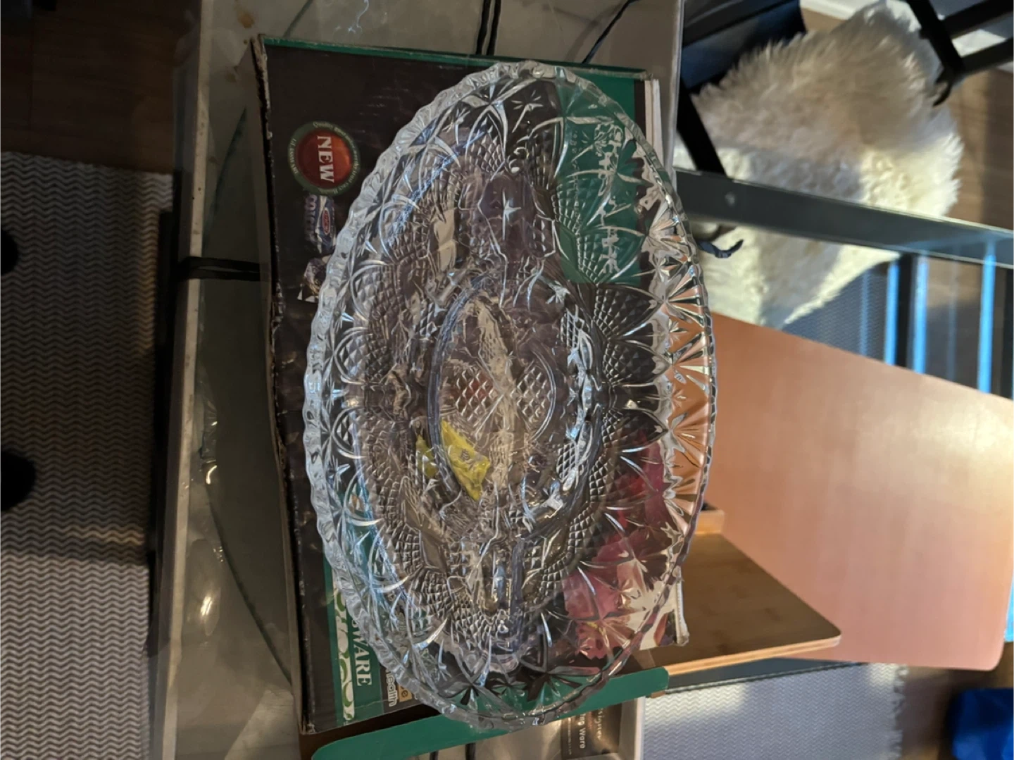 I'm selling a brand new glassware serving platter still in its original box! It's perfect for serving appetizers or desserts at your next gathering. The platter has a beautiful, intricate design. It's a great addition to any table setting!