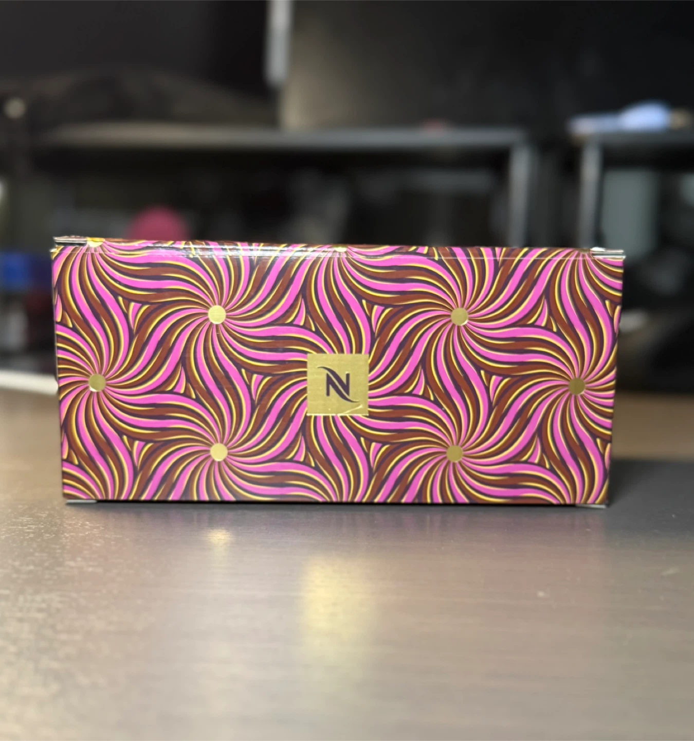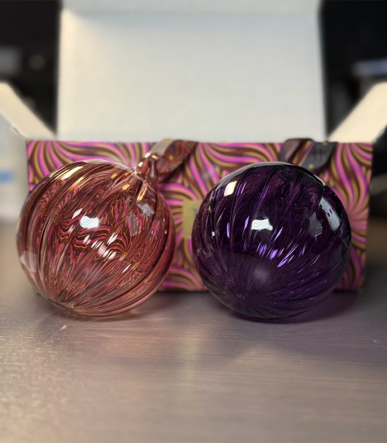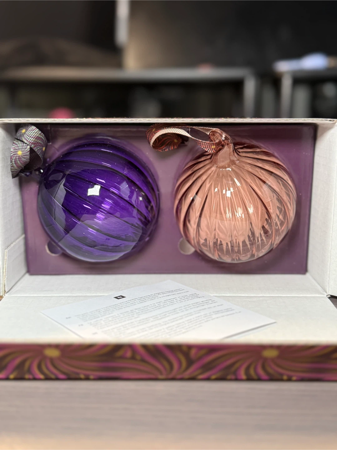 Brand new decorative glass ornaments in complementary purple and blush tones with swirl detailing. Comes as a matching set of two, packaged in the original Nespresso gift box. Everything included as shown in the photos.