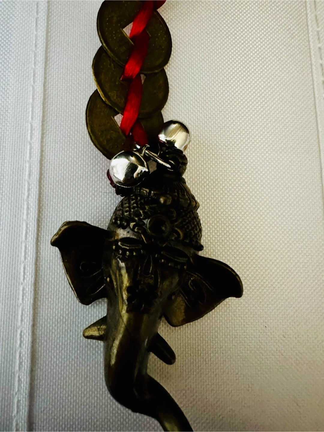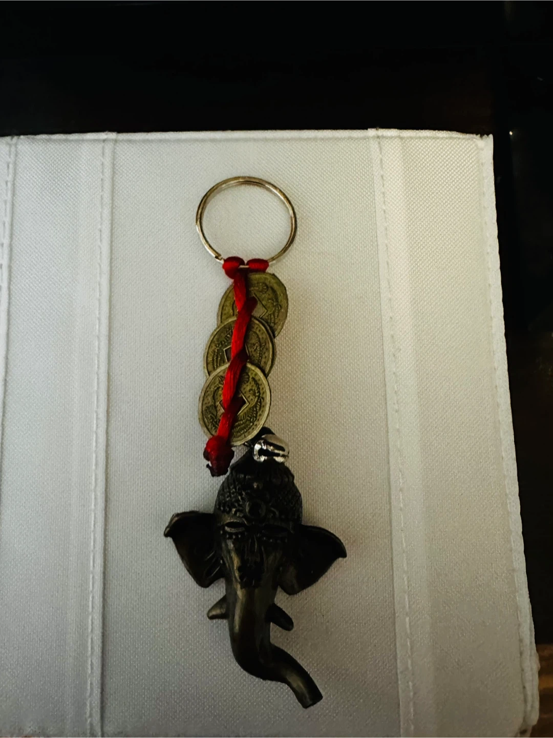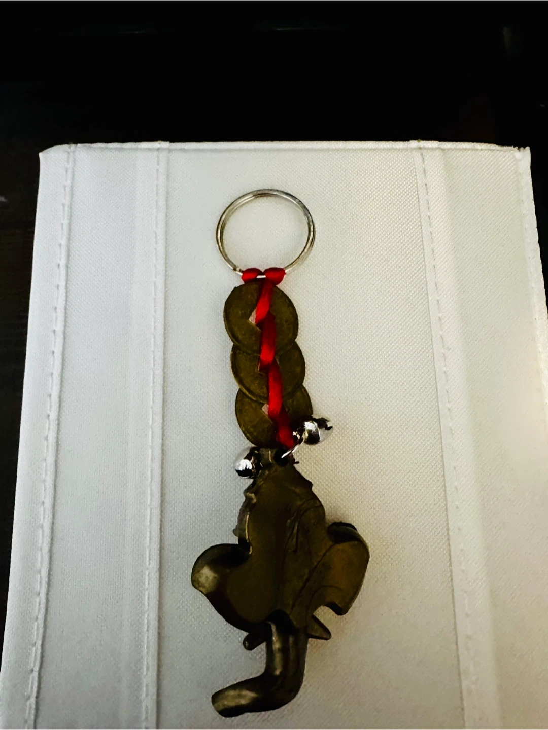 Here's a unique elephant keychain! It features some lucky coins, little bells, and a red ribbon accent. It's in new condition and ready to add some charm to your keys or bag