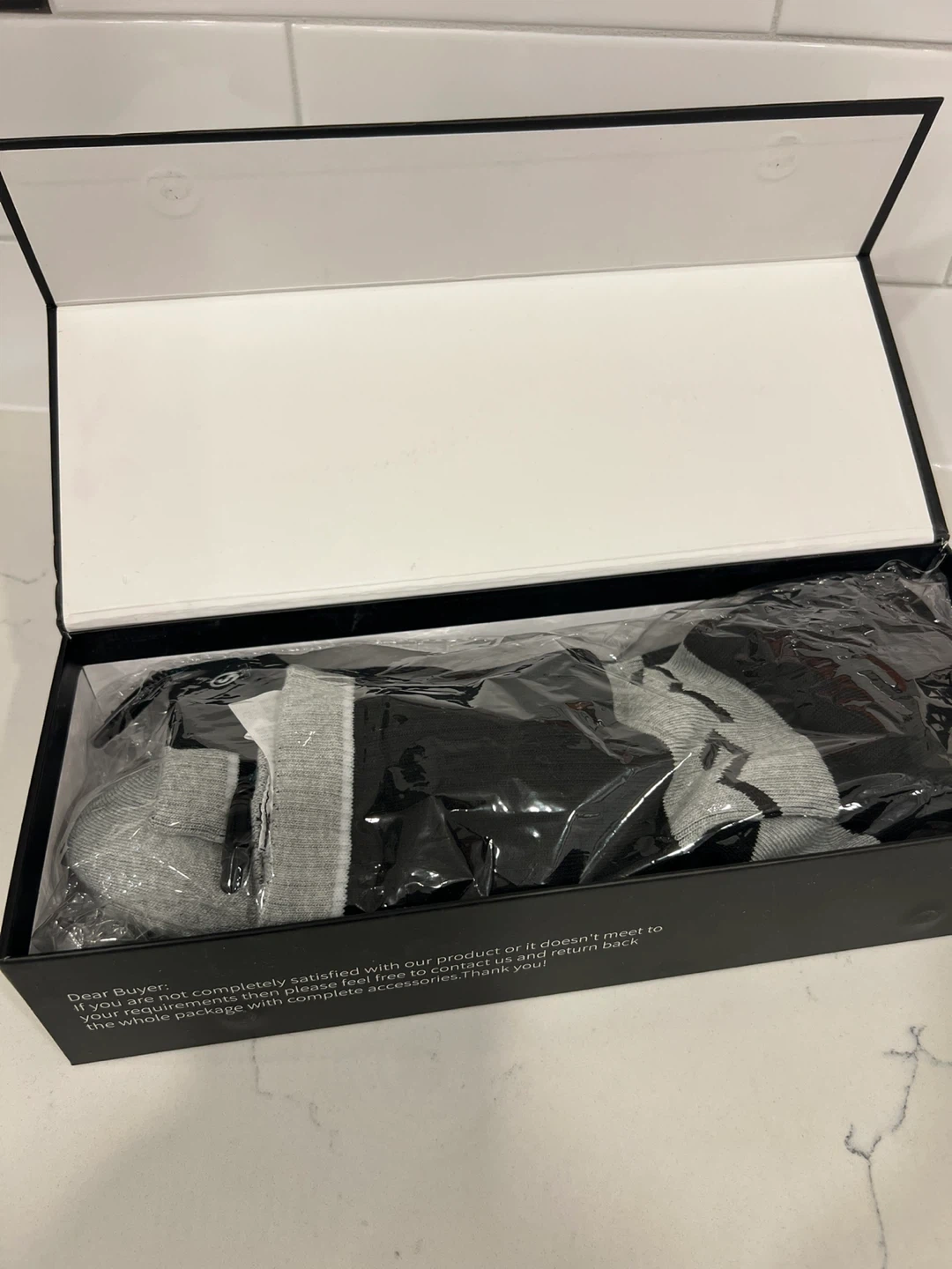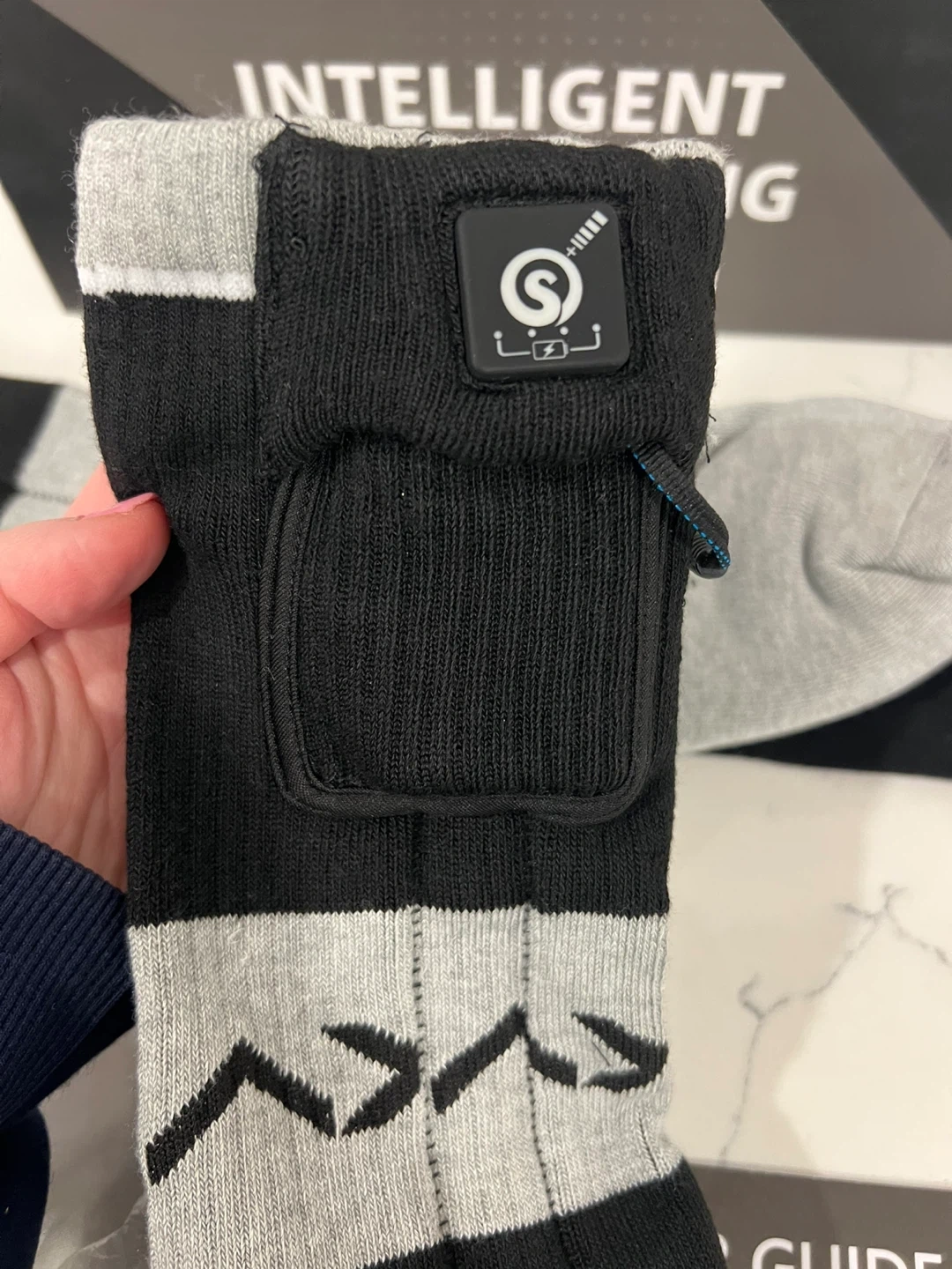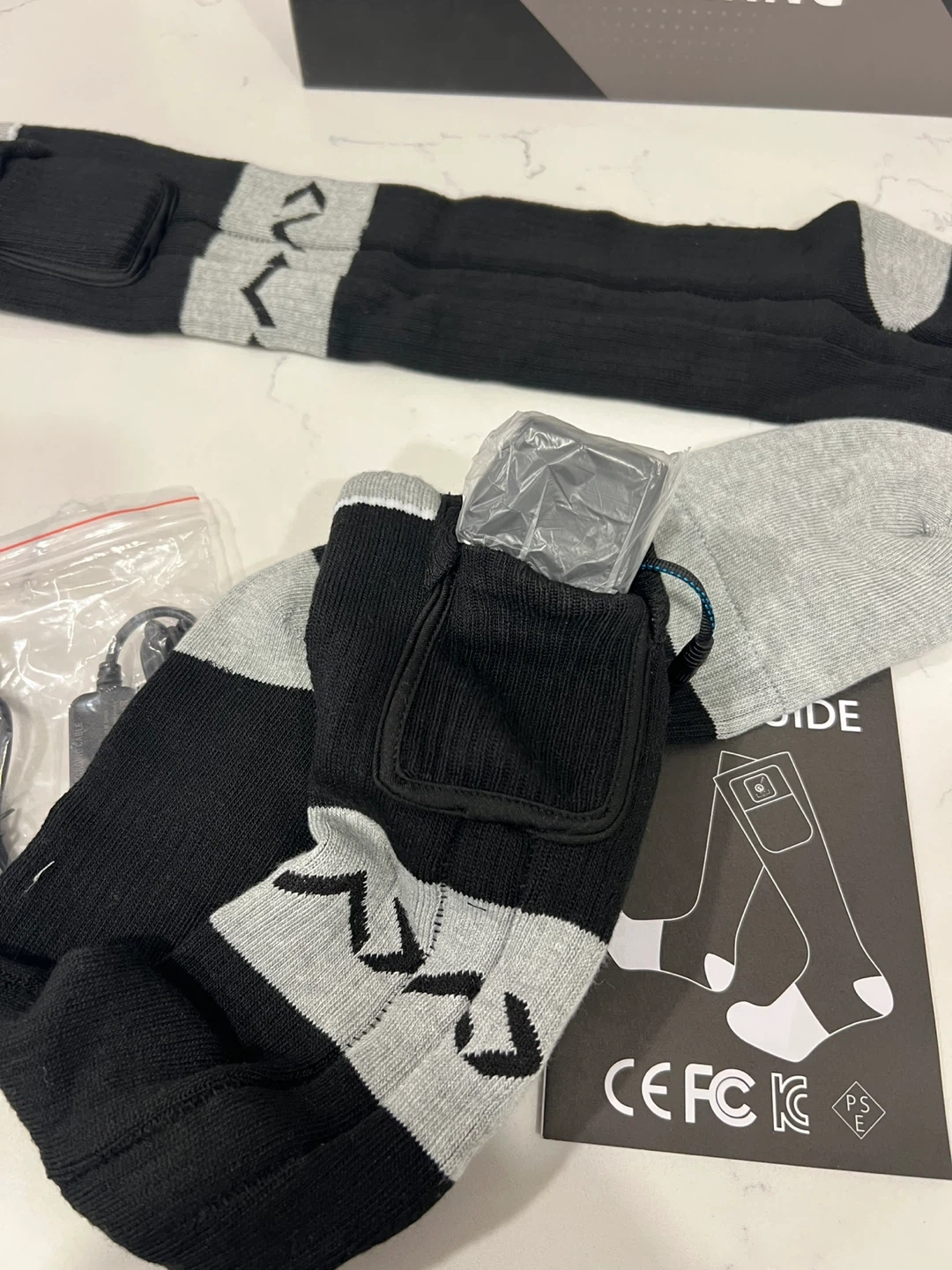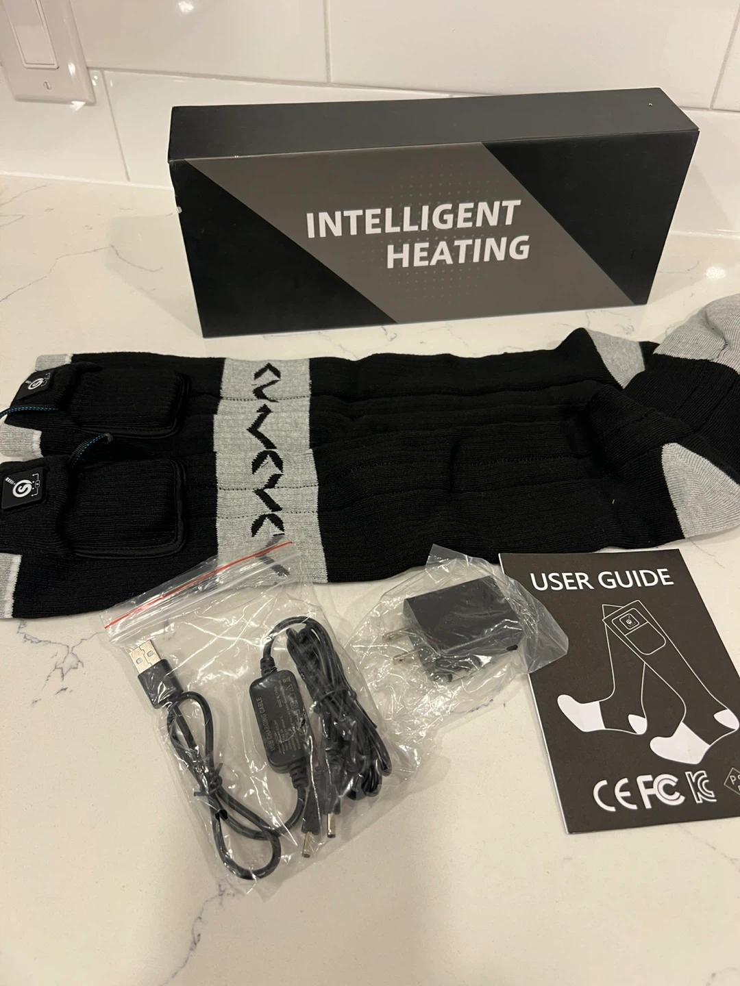 I'm selling a brand new pair of Intelligent Heating socks! They come in the original box and include all components such as the charger and user guide. These socks are perfect for keeping your feet warm and cozy.