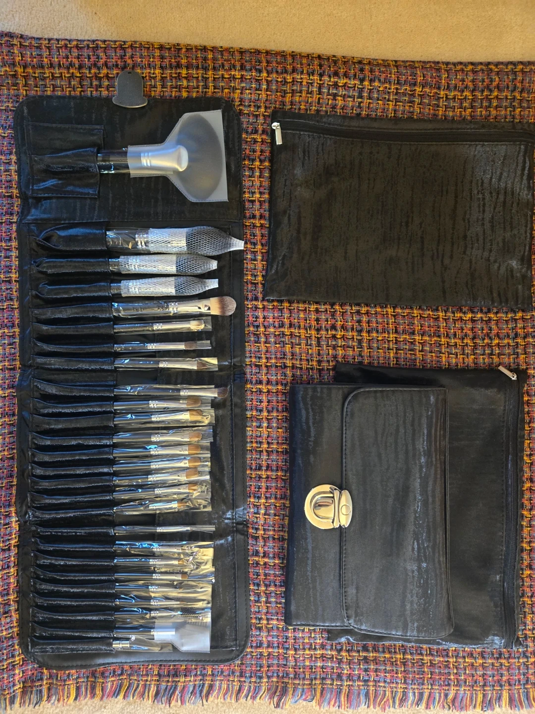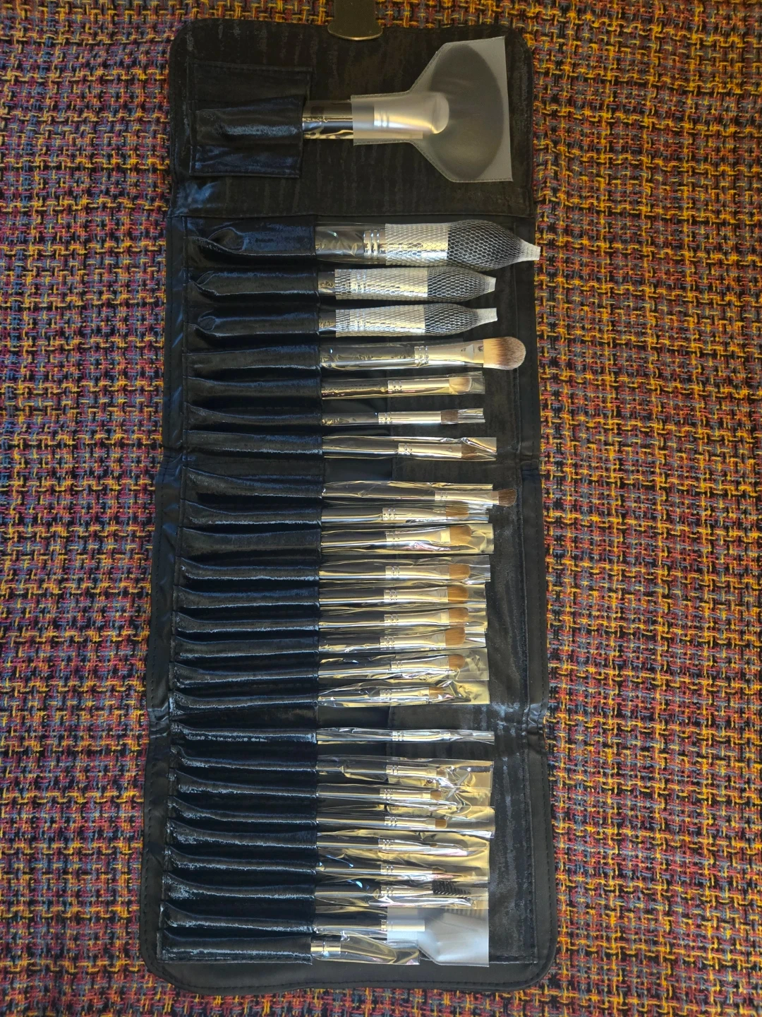 LUXURIOUS complete makeup brush set that comes with a stylish silk black case, which can be used as an extra makeup pouch.The brushes are natural fibers not synthetic. 26 pieces of makeup brushes, all individually packed.Perfect for both beginners and professionals. $35 each. DISCOUNT IF ALL 3 BOUGHT TOGETHER.