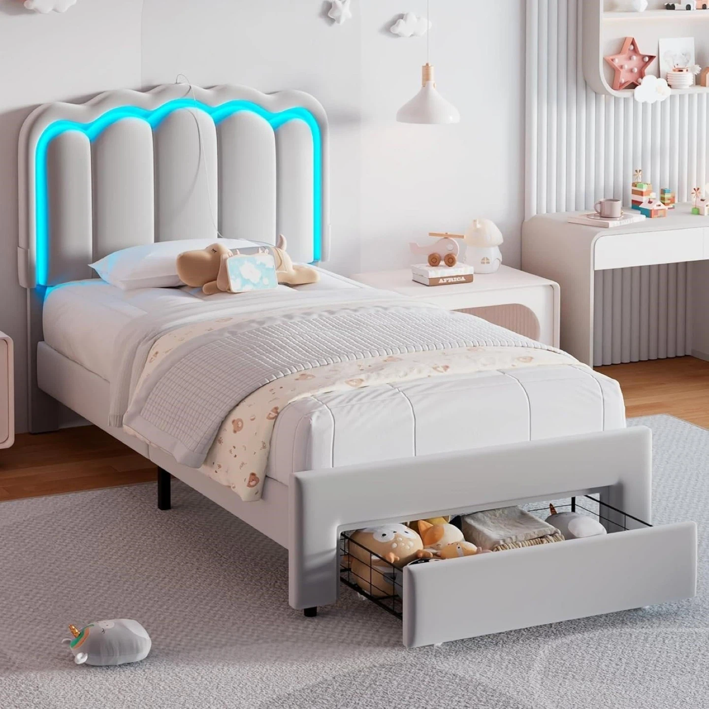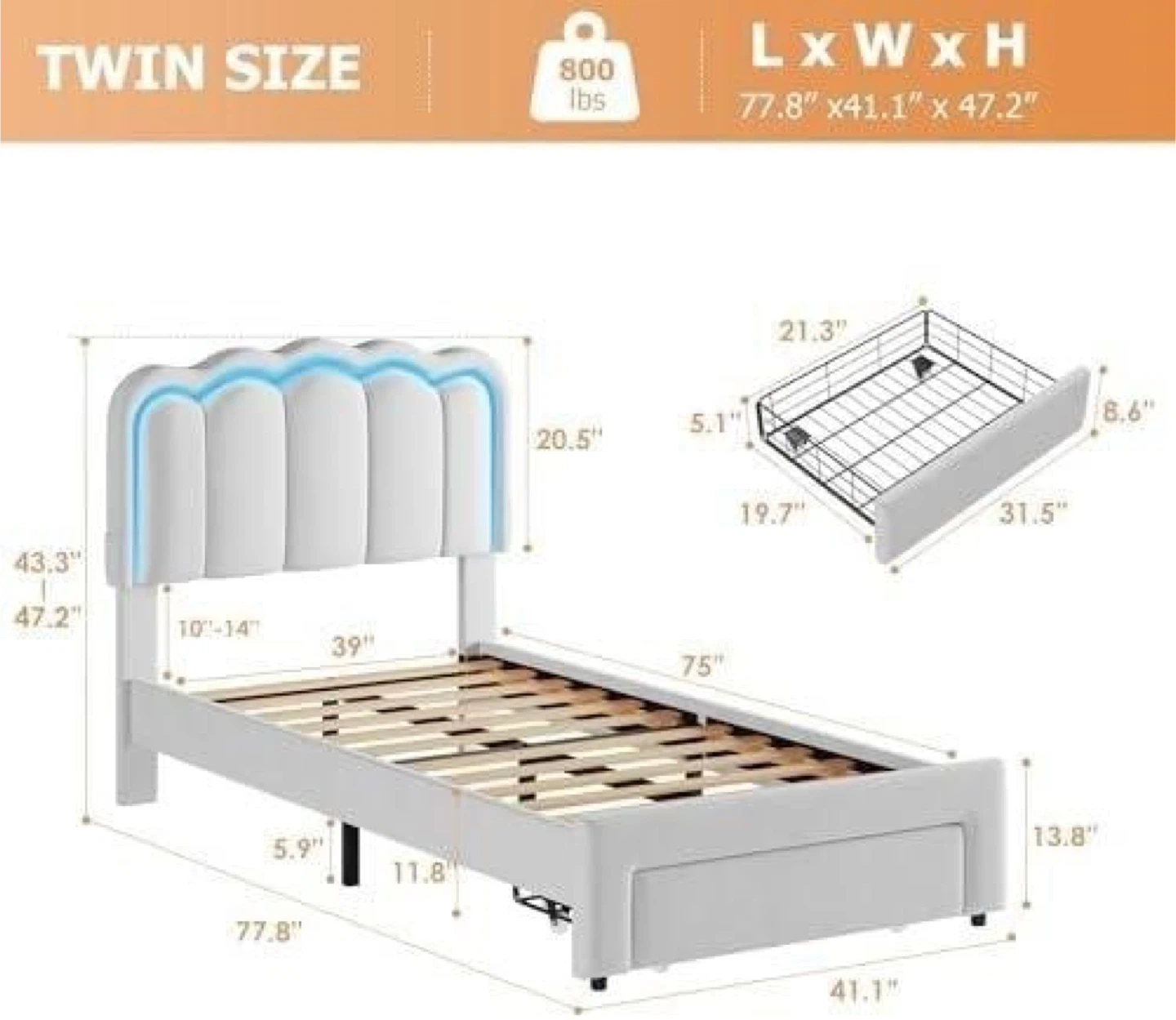 Selling a twin size bed frame. It features a built-in LED light on the headboard, adding a nice touch to any bedroom! It has a modern design and includes a convenient storage drawer at the foot of the bed