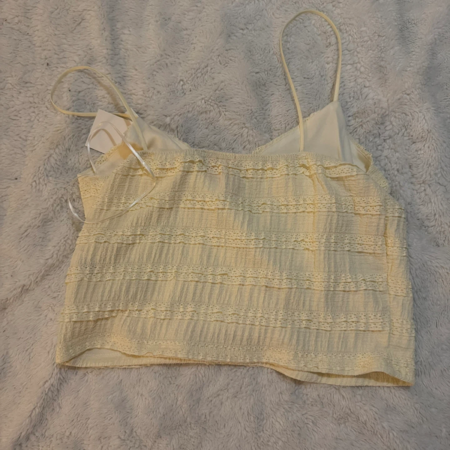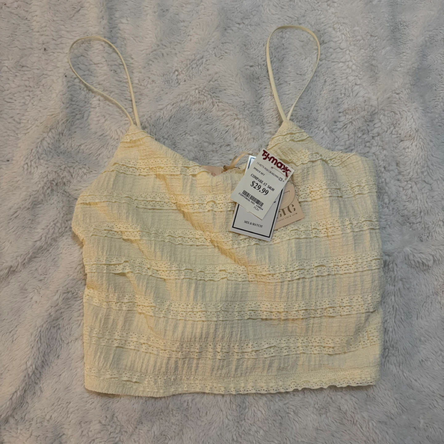 This is a cream-colored AG tank top in size small. The original price tag from TJ Maxx is still attached, showing it was originally $29.99. It has a textured, tiered design and delicate straps. Perfect for a light and airy look!
