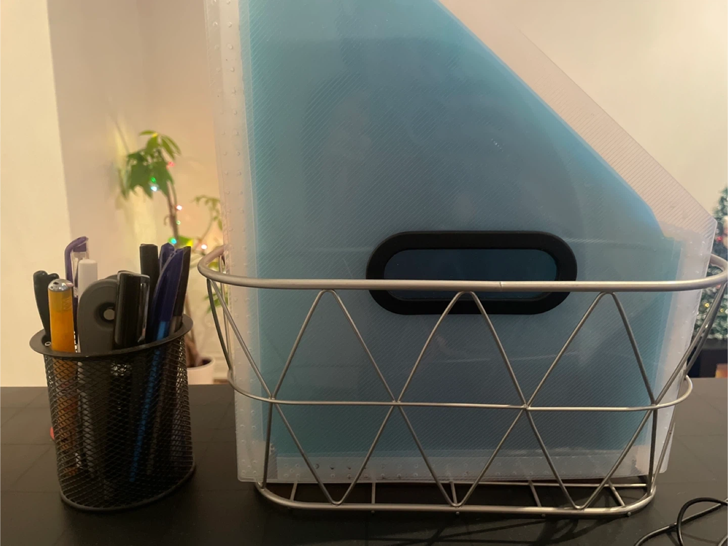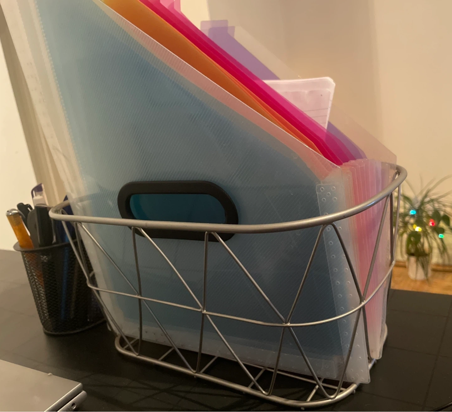 Selling a desk organizer set, including a black mesh pen holder and a wire basket filled with colourful file folders.