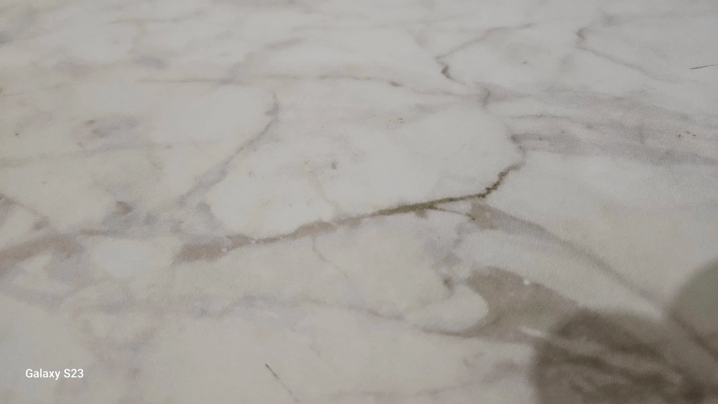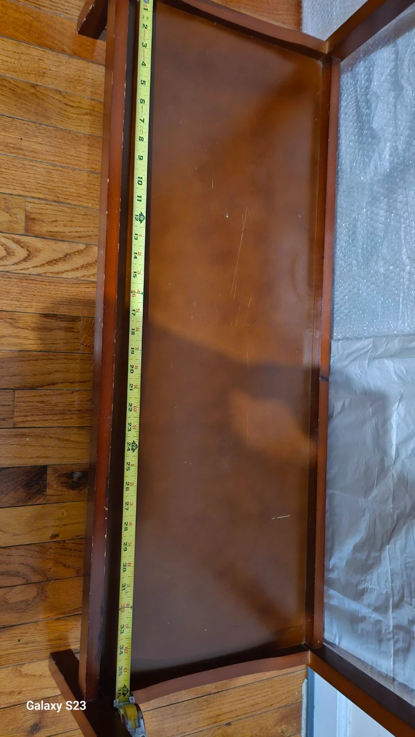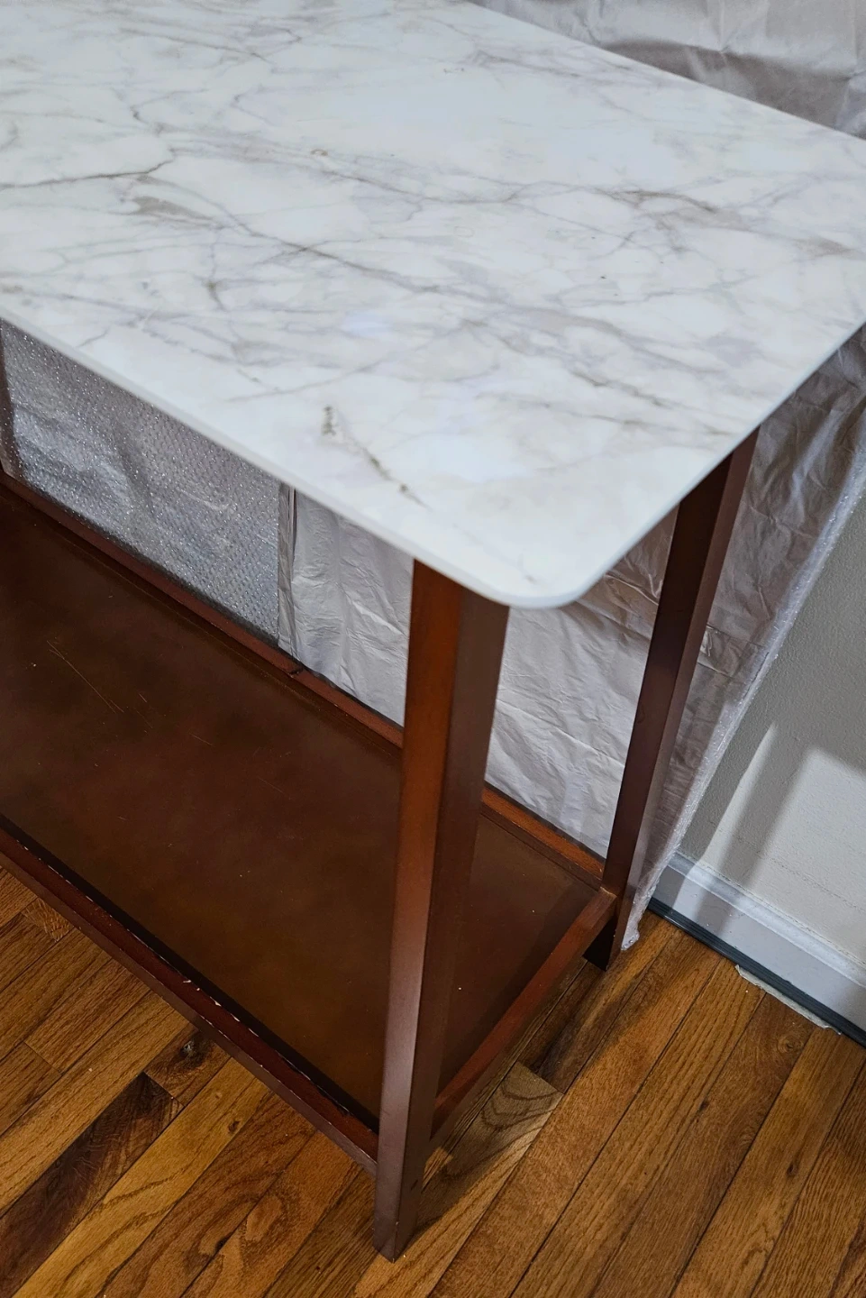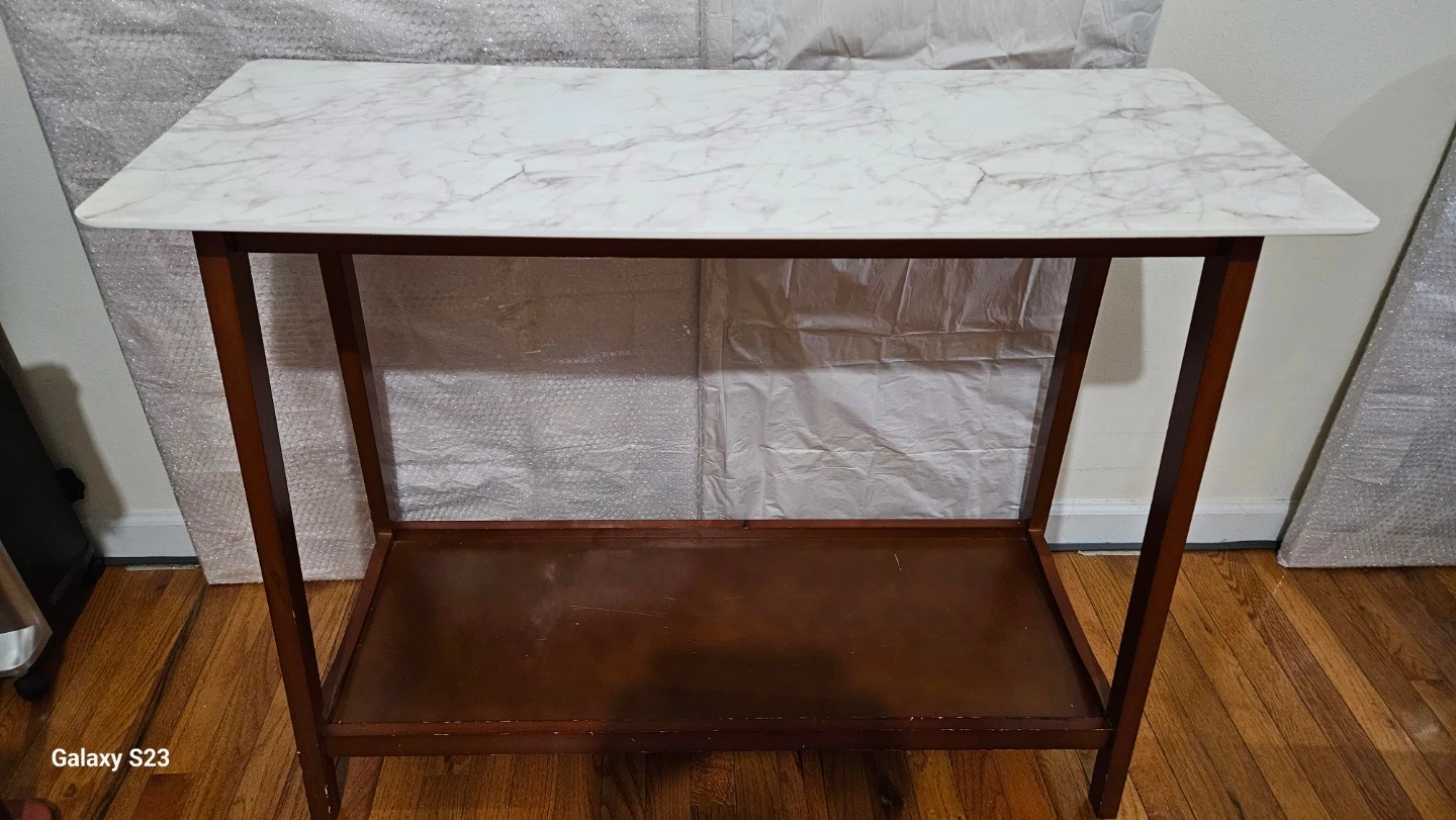Selling a console table with a faux marble top and brown wooden frame. The bottom shelf provides extra storage or display space.