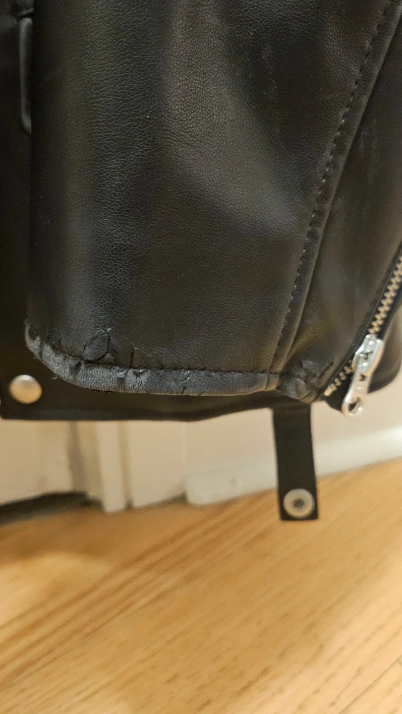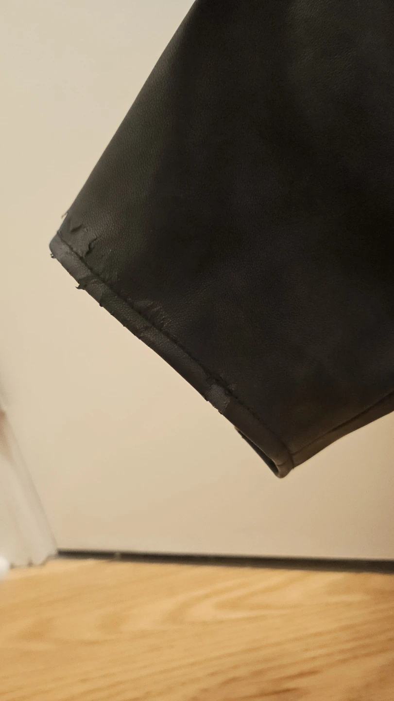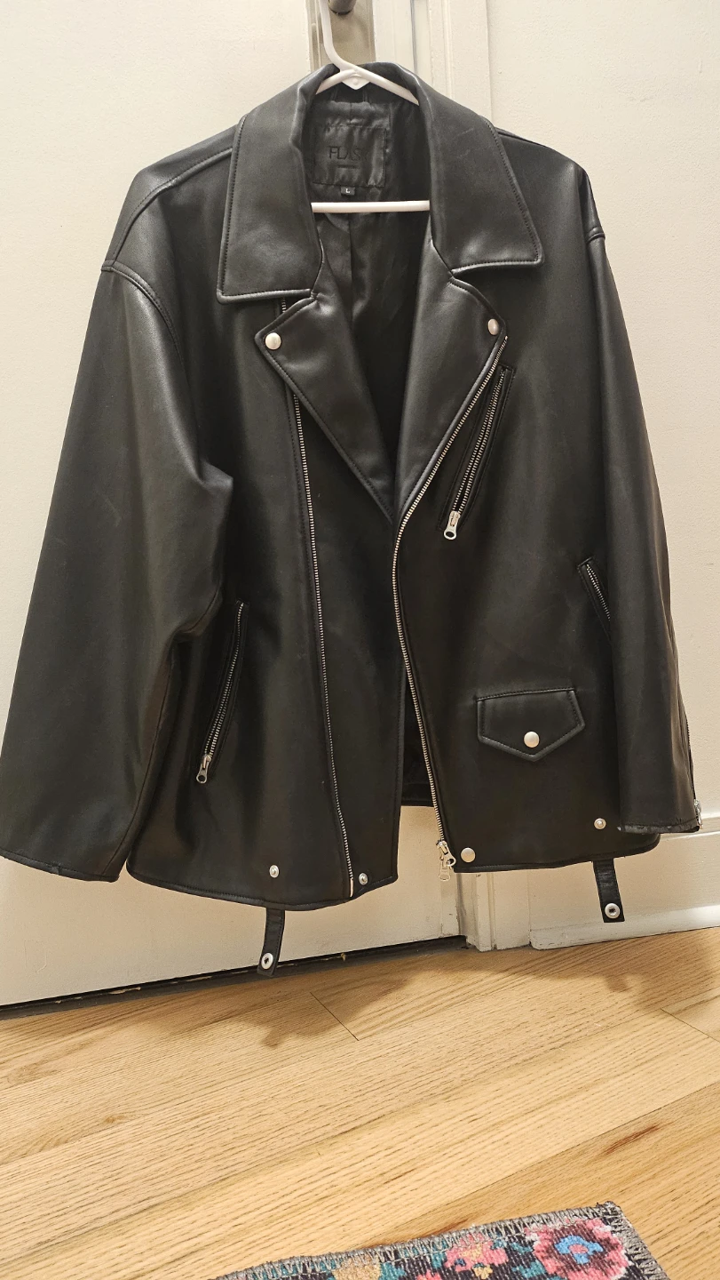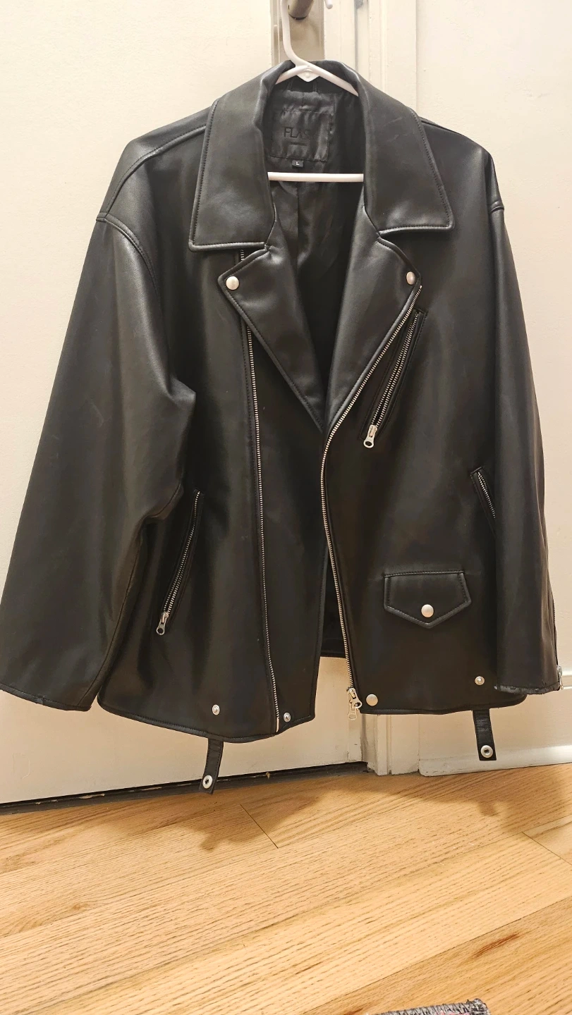 Selling a black faux leather jacket from Korea. It's an oversized fit. Please note that there is some wear on the edges of the both sleeves, as shown in the photos. Thank you!