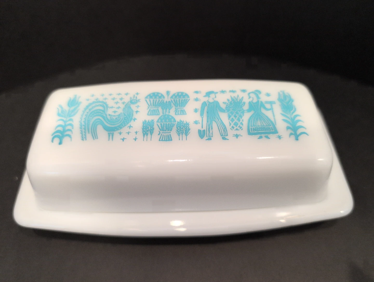 Selling a vintage Pyrex butter dish in excellent condition! No chips, no cracks, no butterfingers here ;) It features the lovely turquoise Amish butterprint design on the lid. Perfect for adding a touch of retro charm to your kitchen