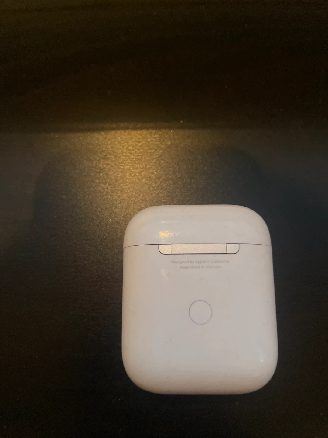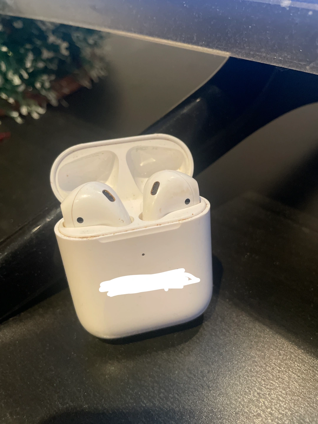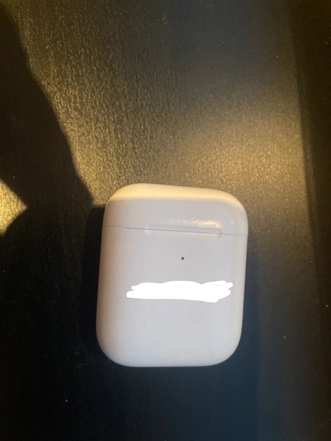 Selling a pair of used Apple AirPods with charging case. There is a name embossed on the cover that I have redacted. Plays music for 1-2 hours in each charge.