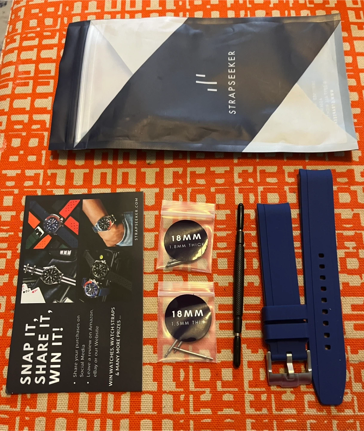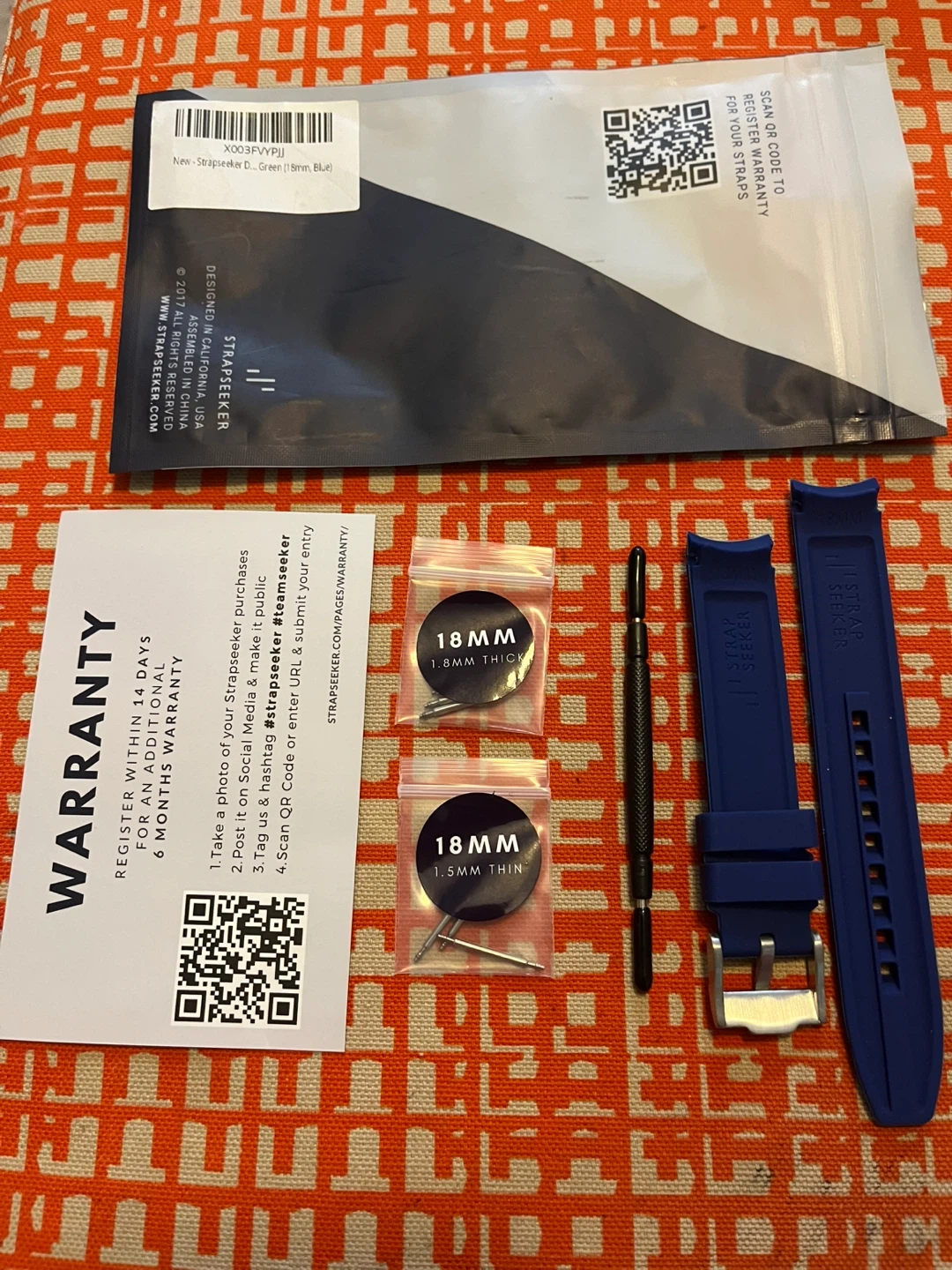 Selling a brand new StrapSeeker watch strap in blue! It's 18mm and comes with both 1.8mm thick and 1.5mm thin pins. Also included is the tool for easy strap changes. The original packaging is included too!