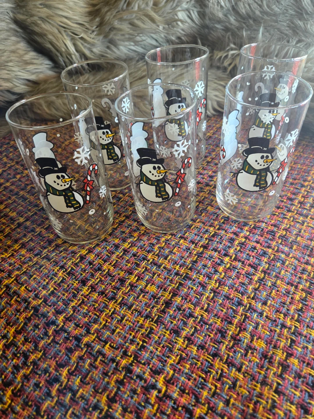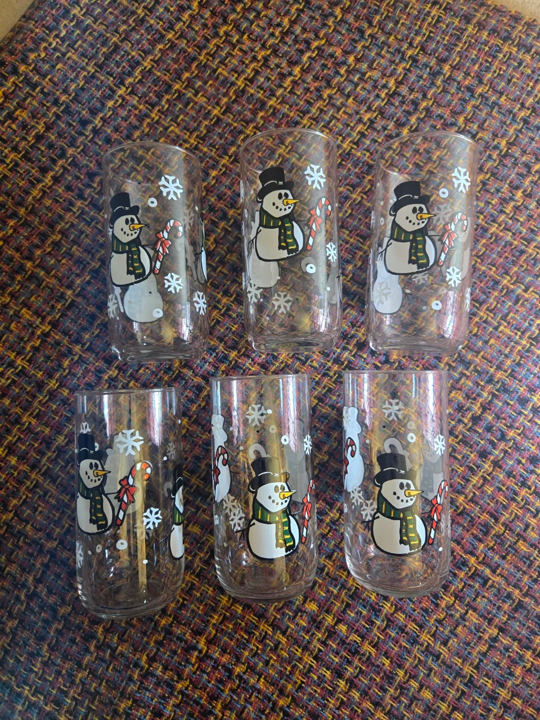 Selling a set of six hand painted drinking glasses, perfect for the holiday season! They feature a cute snowman design with snowflakes and candy canes. Great for festive gatherings!