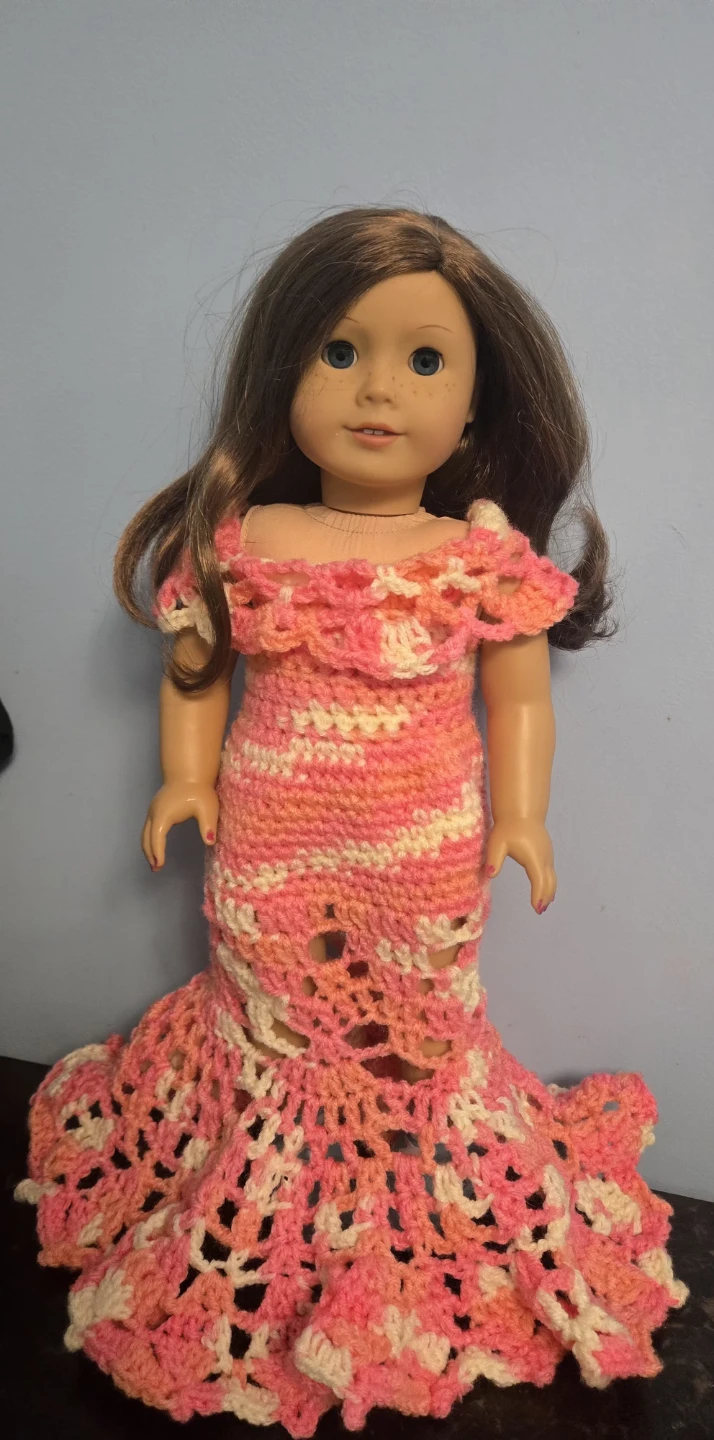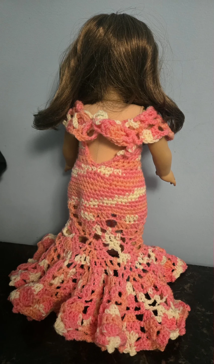 Check out this adorable handmade crochet dress for dolls! It's a pretty mix of pink and white, perfect for dressing up your favourite doll. The dress has a unique open-back design and a lovely ruffled neckline. It's in great condition and ready for a new doll to wear it!