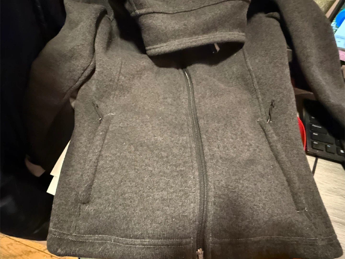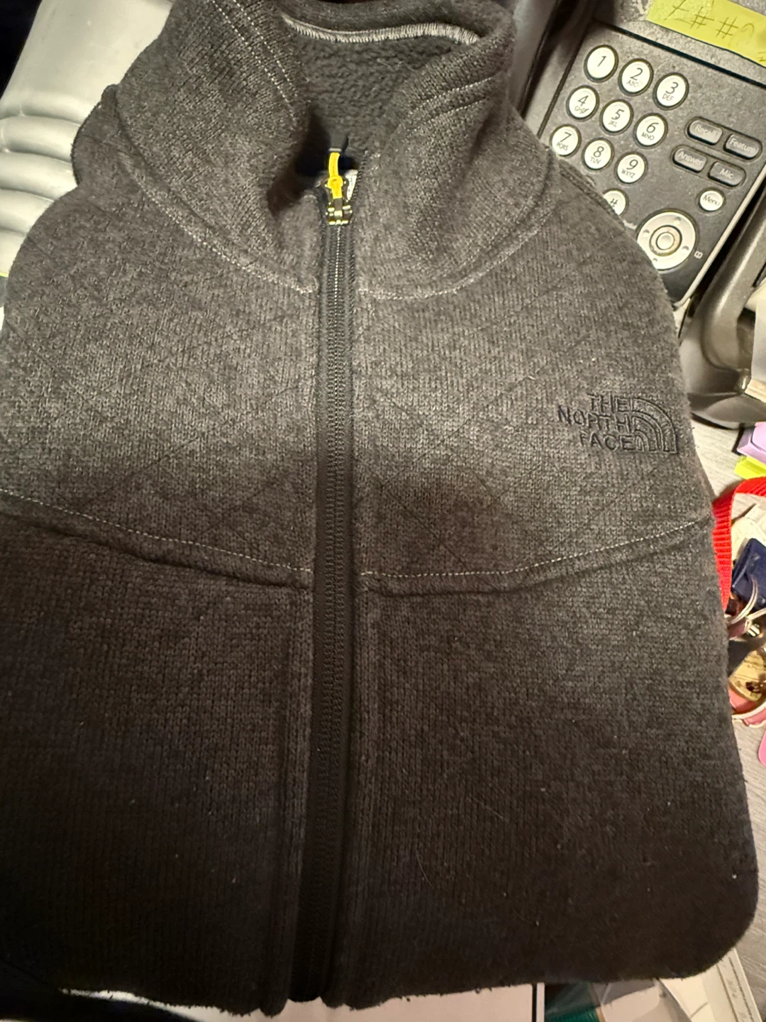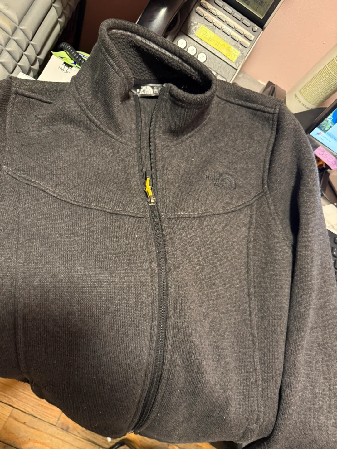 Selling a The North Face fleece jacket in size medium. It's a stylish and comfortable jacket, perfect for layering or wearing on its own during cooler weather. The jacket is gray and features the iconic The North Face logo.