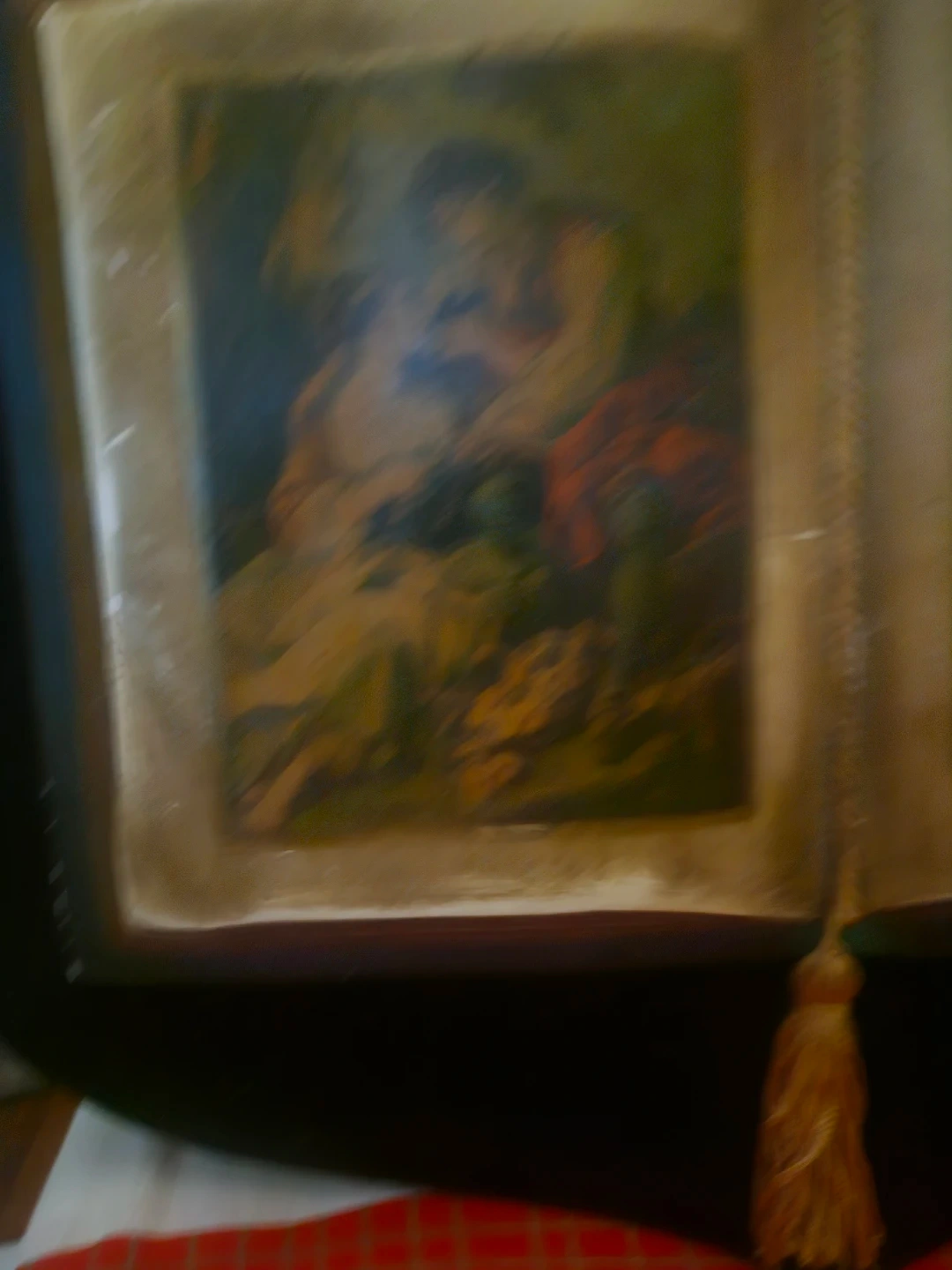 Unique VTG 70s, ceram.ic book, velvet frame featuring art prints. It's a The frame is in good condition and ready to be hang.