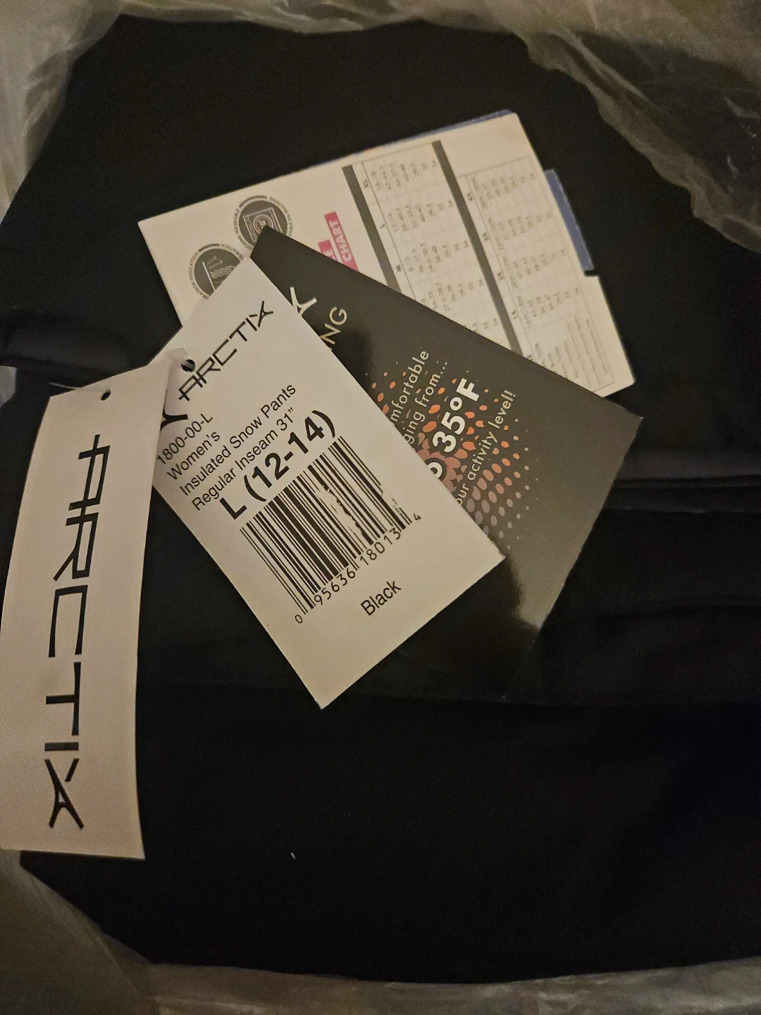 Selling a pair of Arctix women's insulated snow pants in black, size large (12-14). These pants are designed to keep you comfortable even in temperatures as low as -35°F, perfect for any activity level in the snow! They are regular inseam 31".