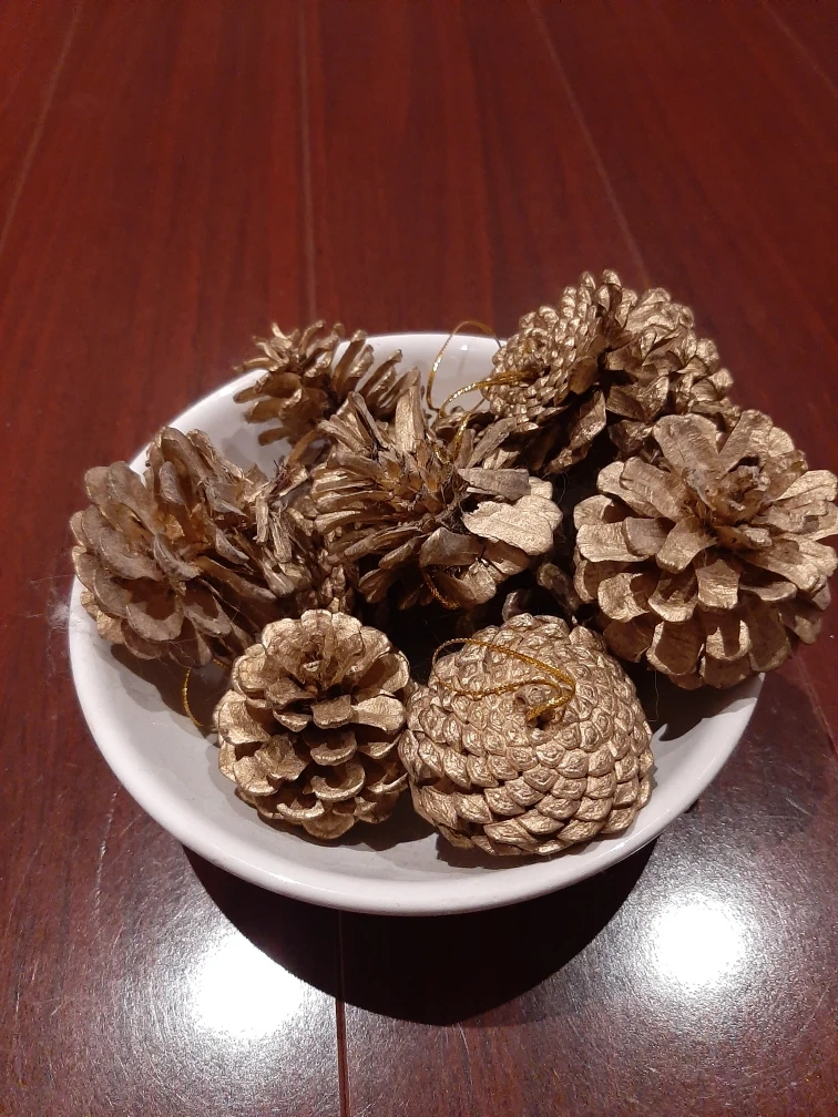 Free bowl and set of gold-painted pinecone Christmas ornaments! They're perfect for adding a touch of natural elegance to your holiday decor. These are in great condition and ready to adorn your tree or festive arrangements.
