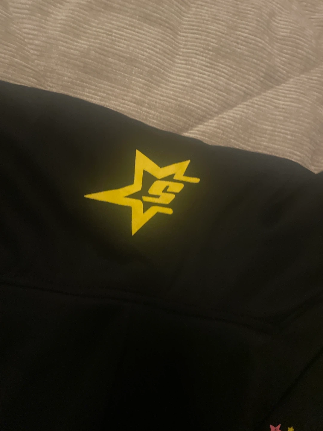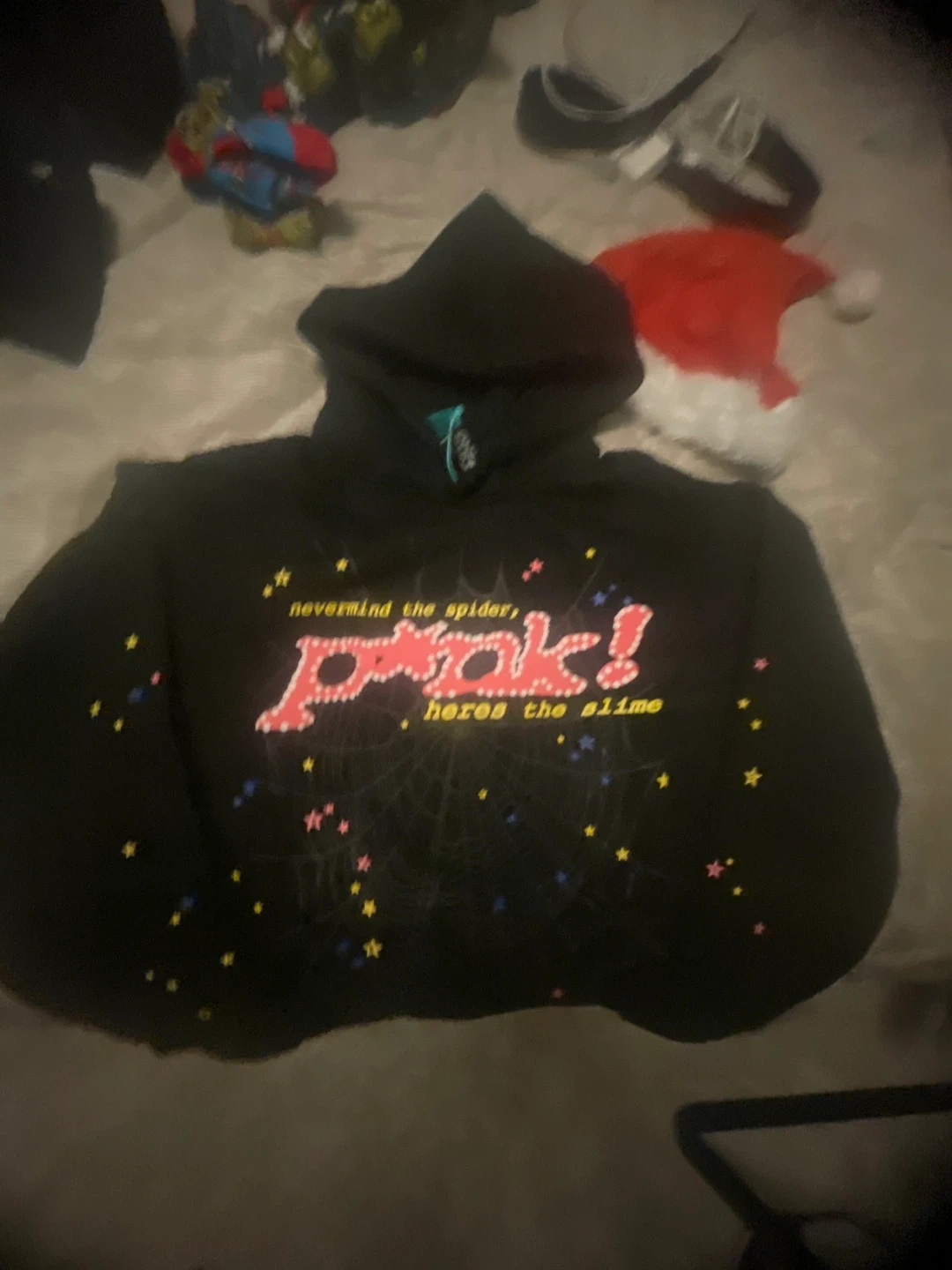 Selling a Sp5der black hoodie. The hoodie features a colourful design with the Sp5der logo and some text. It's in great condition!