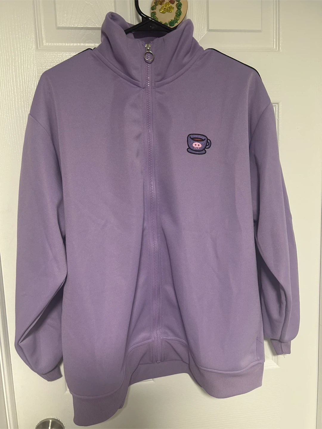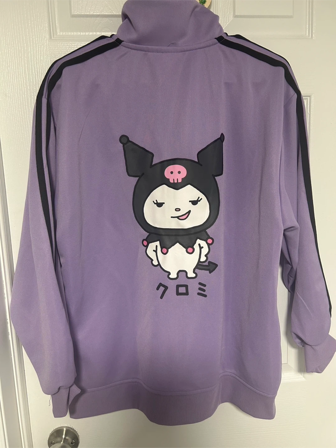 Here's a super cute Sanrio Kuromi track jacket in a lovely shade of purple! It features Kuromi on the back and a small design on the front. Perfect for adding a touch of kawaii to your wardrobe