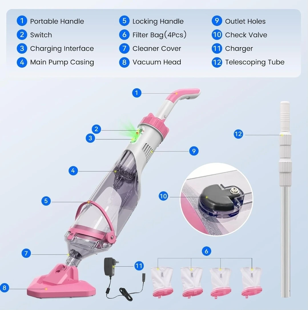 This Enhulk handheld cordless pool vacuum delivers powerful suction and long battery life, making it perfect for above-ground pools, hot tubs, spas, and tight corners. Lightweight, easy to use, and ready to go.