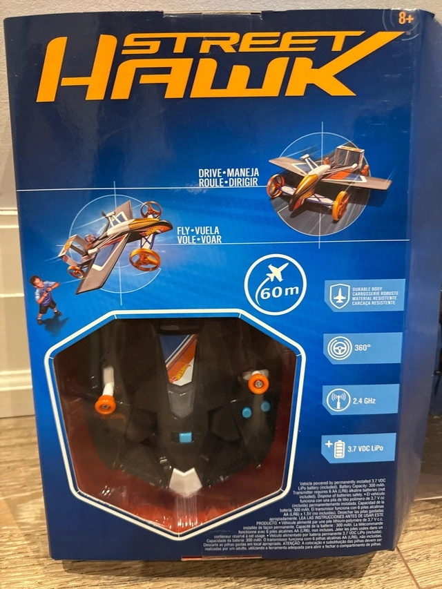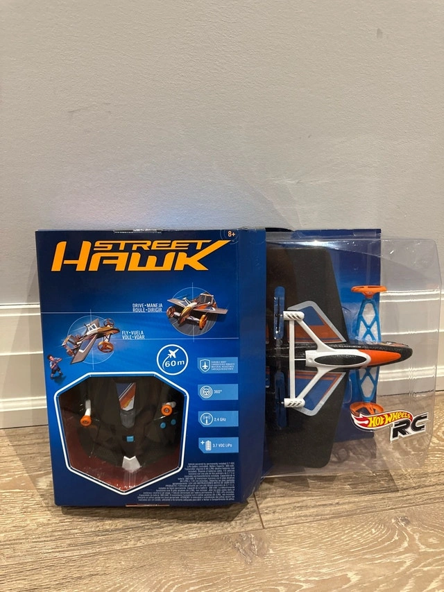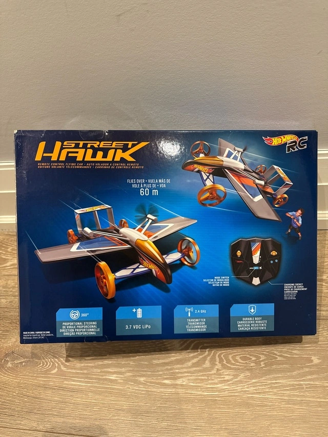 I'm selling a Hot Wheels Street Hawk, brand new in its original packaging! This remote-controlled flying car is ready for action, offering both driving and flying capabilities for ages 8 and up. It boasts a durable, robust material and 360 degree steering capabilities. It operates on a 2.4 GHz frequency and is powered by a 3.7 VDC LiPo battery. If the ad is up, it's available!