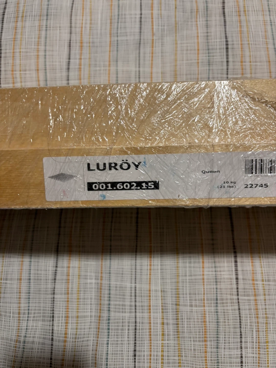 Selling a brand new, still-in-packaging set of IKEA Luröy bed slats for a queen-sized bed. These are ready to support your mattress and provide a comfortable night's sleep. No longer needed.