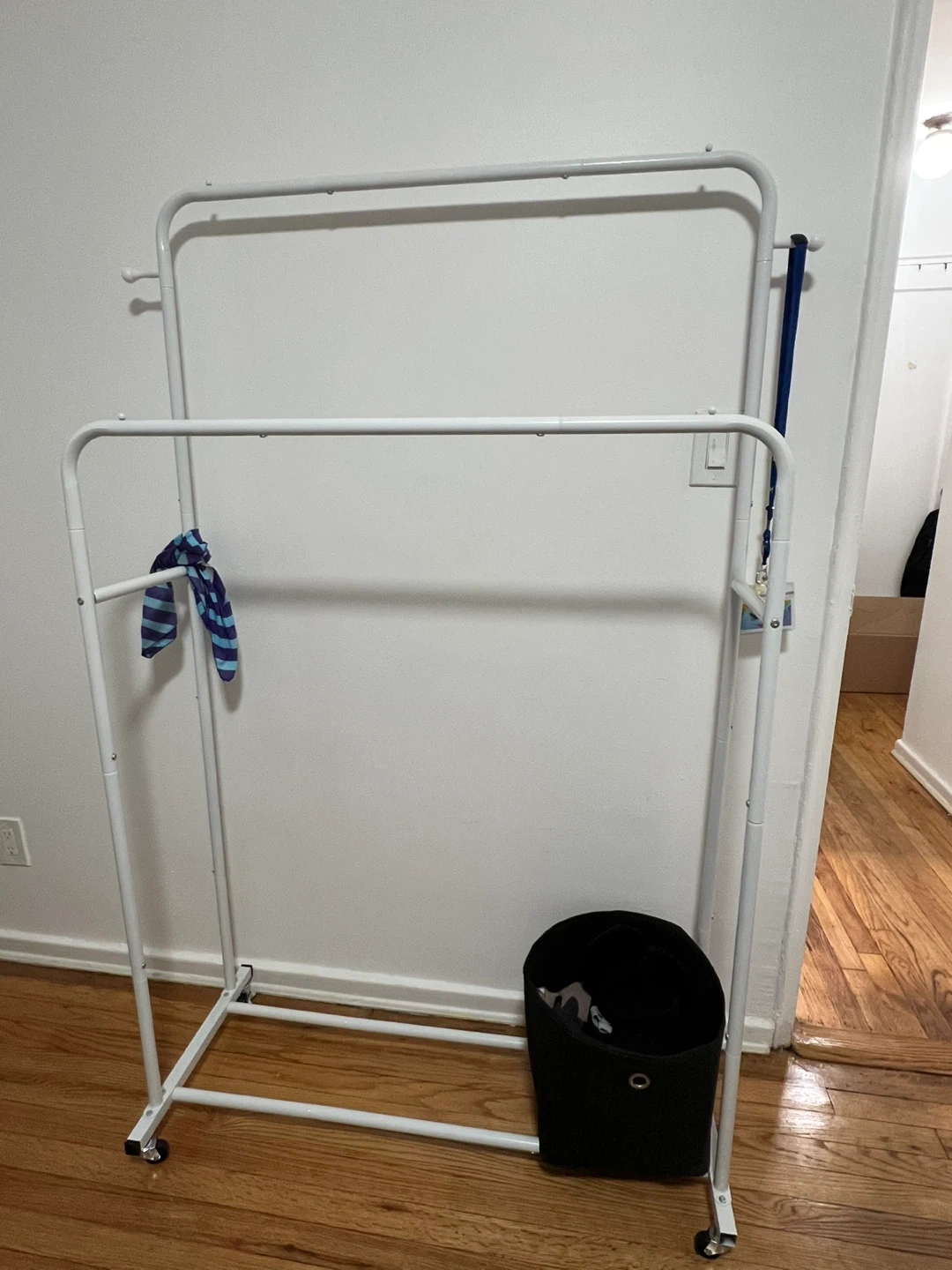 Selling a double rods garment rack! It's perfect for hanging clothes and adding extra storage to your bedroom or closet. It comes with 4 hooks and is a multi-functional bedroom clothes rack. Lightly used for about 4 months