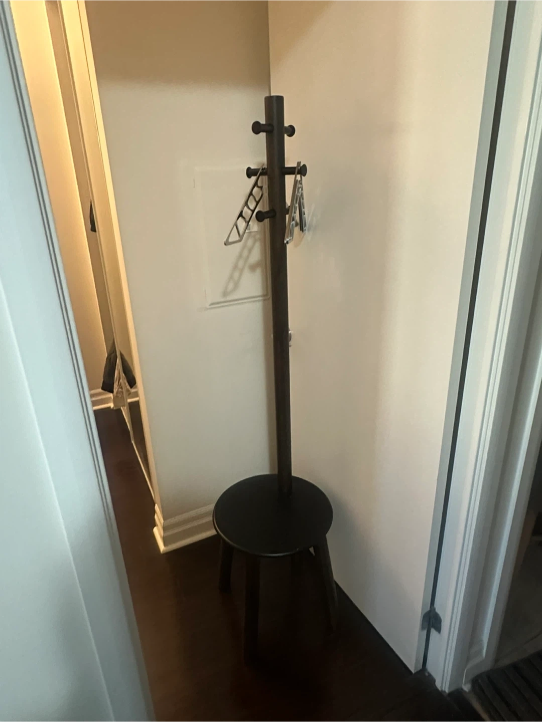 Selling a dark brown coat rack with a built-in stool! It's in great shape and ready to hold your coats and provide a convenient spot to sit while putting on your shoes