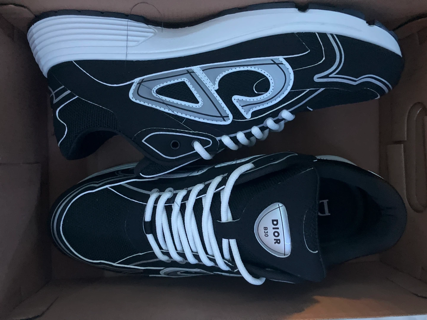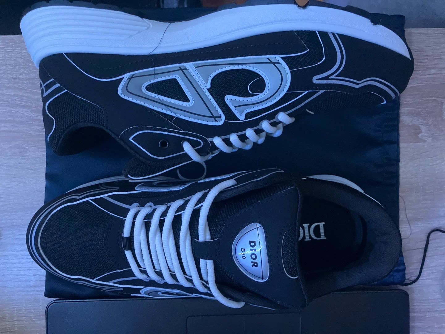 Selling a pair of Dior B30 sneakers in black and white. They come with the original box and Dior dust bag! The shoes are in perfect Condition. Only worn once and it was inside to try them on.