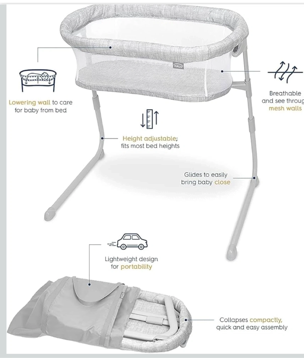 Selling a Halo BassiNest Swivel Sleeper in excellent condition! This bassinet is designed to bring your baby close and makes nighttime feedings easier. It features breathable mesh walls and an adjustable height to fit most bed heights. It also glides easily and has a lightweight design for portability. The bassinet collapses compactly for quick and easy assembly, and it comes with a carrying bag!