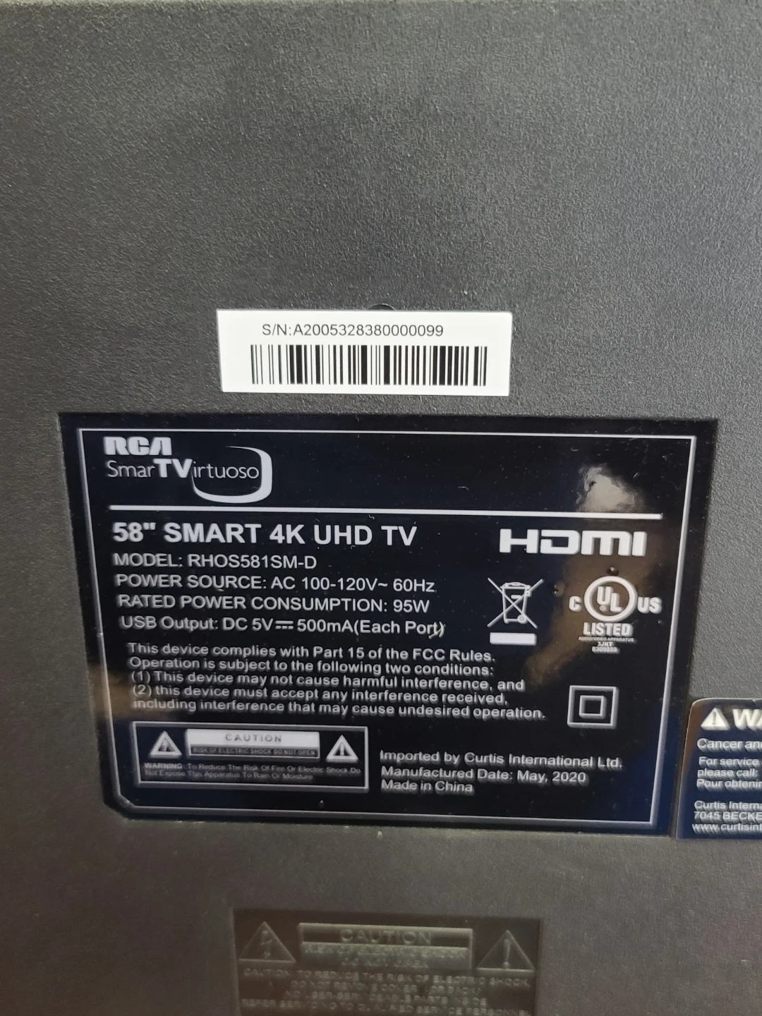 An RCA 58" Smart 4K UHD TV, model RHOS581SM-D And Stand. It's in great shape and ready for a new home entertainment setup! This TV has a power source of AC 100-120V~ 60Hz and a rated power consumption of 95W. It also features a USB output of DC 5V 500mA (Each Port). Delivery can be arranged. Viewing and pickup by appointment.