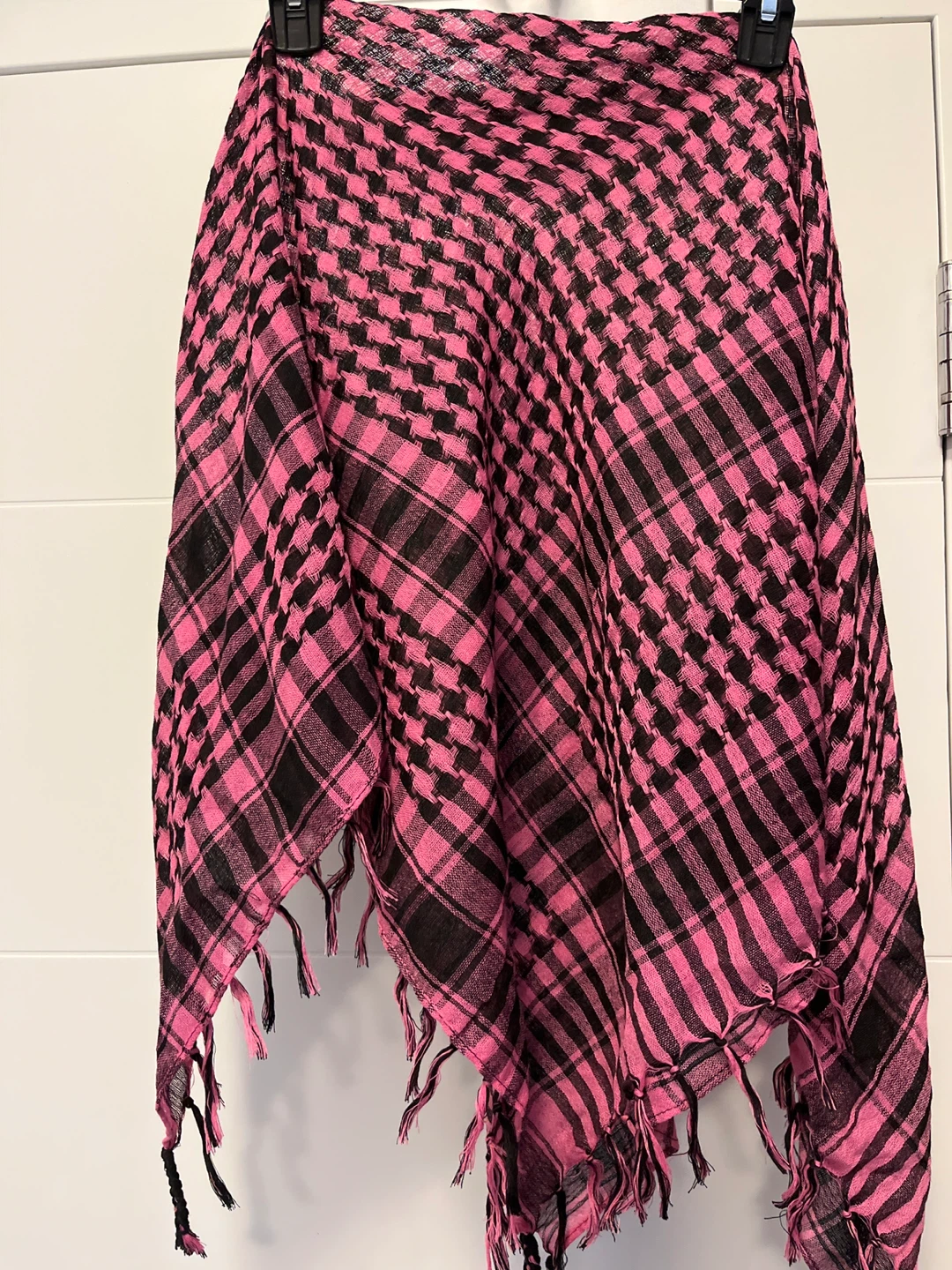 Selling a pink and black plaid scarf. It has a nice pattern and fringe detailing. Perfect for adding a pop of colour to your outfit!