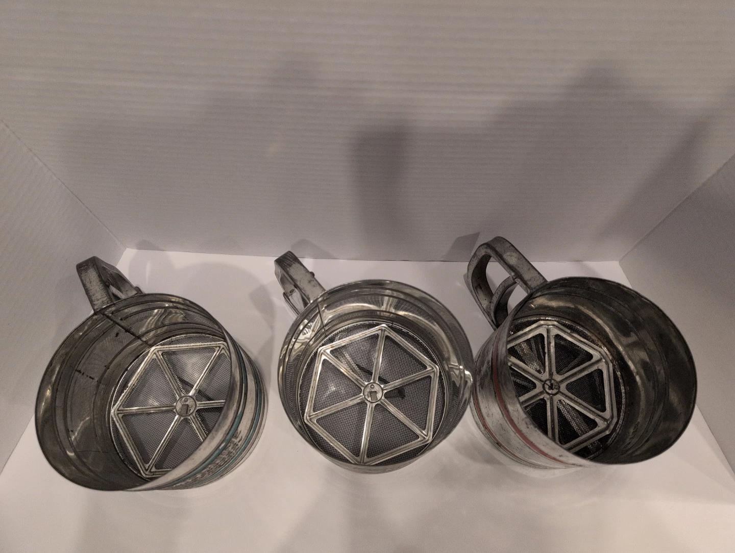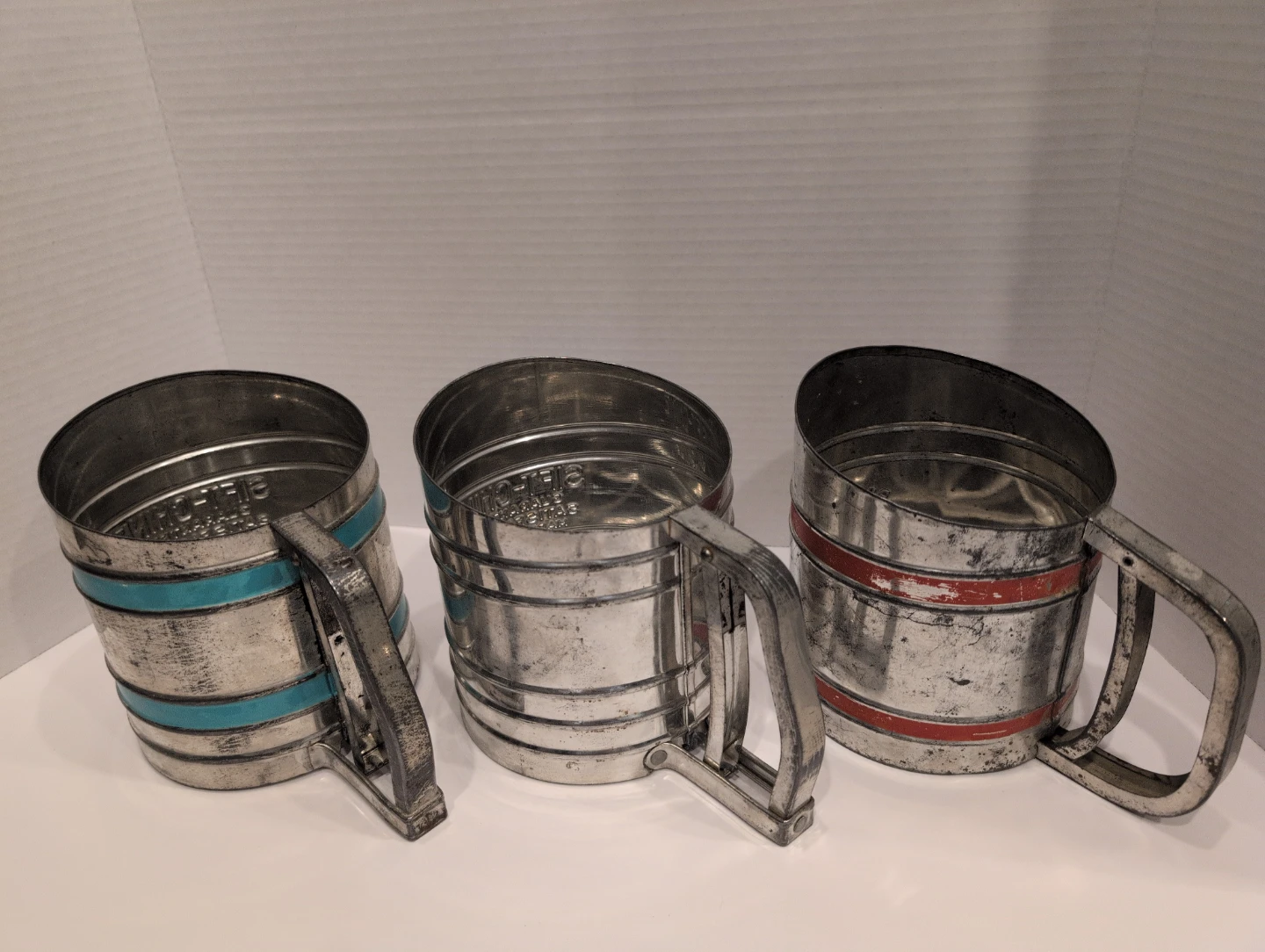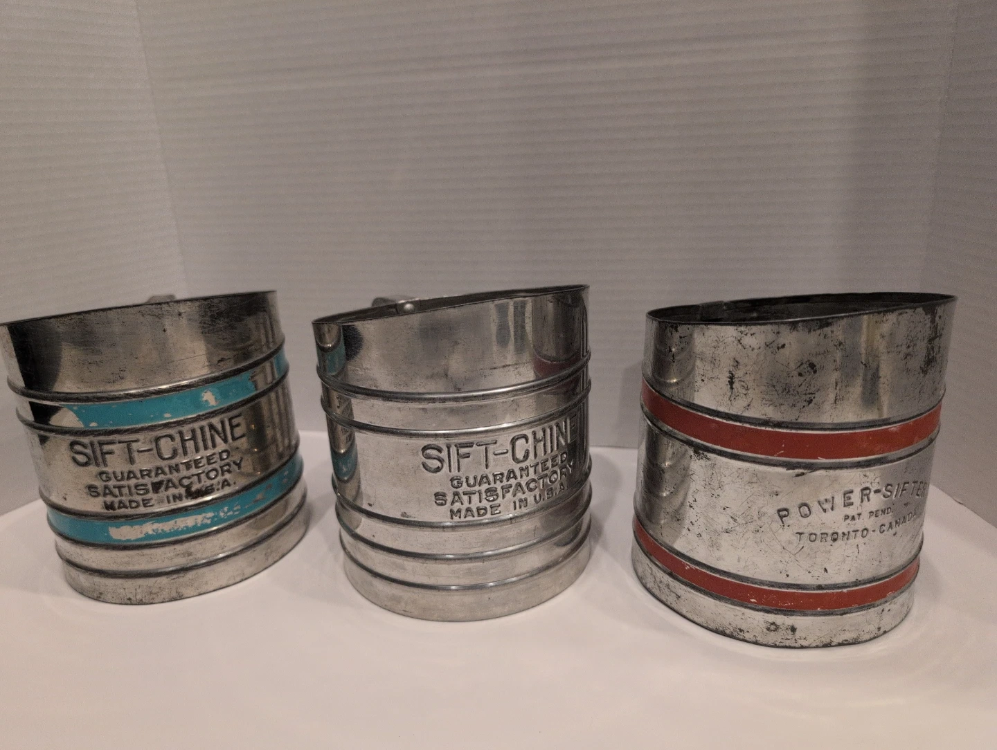Selling a set of 3 vintage flour sifters! There's two 'Sift-Chine' sifters and one 'Power-Sifter' sifter. They all have a unique look and feel, great addition for the vintage kitchen collector.