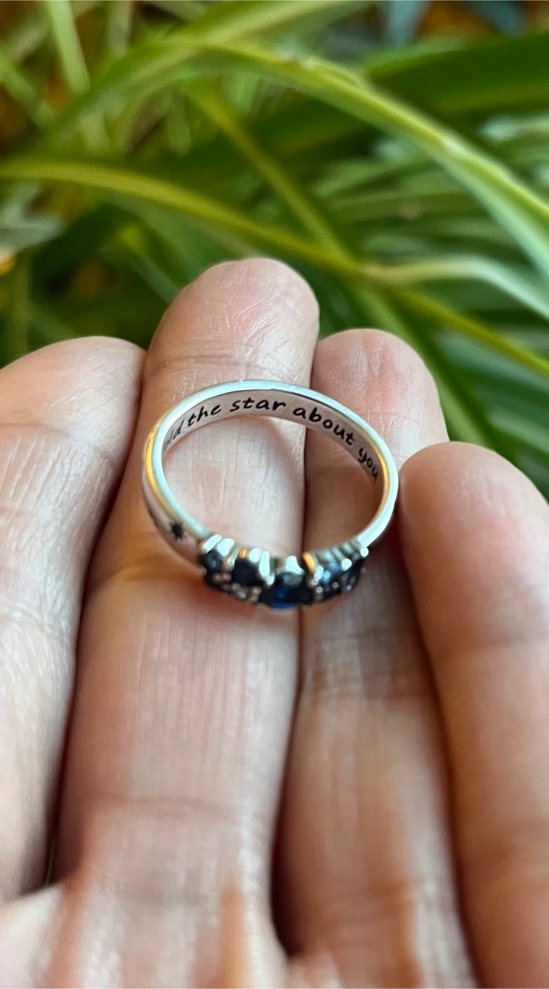 Selling a lovely silver ring featuring a row of blue stones. It has an inspirational message “In told the star about you “ carved inside the band .