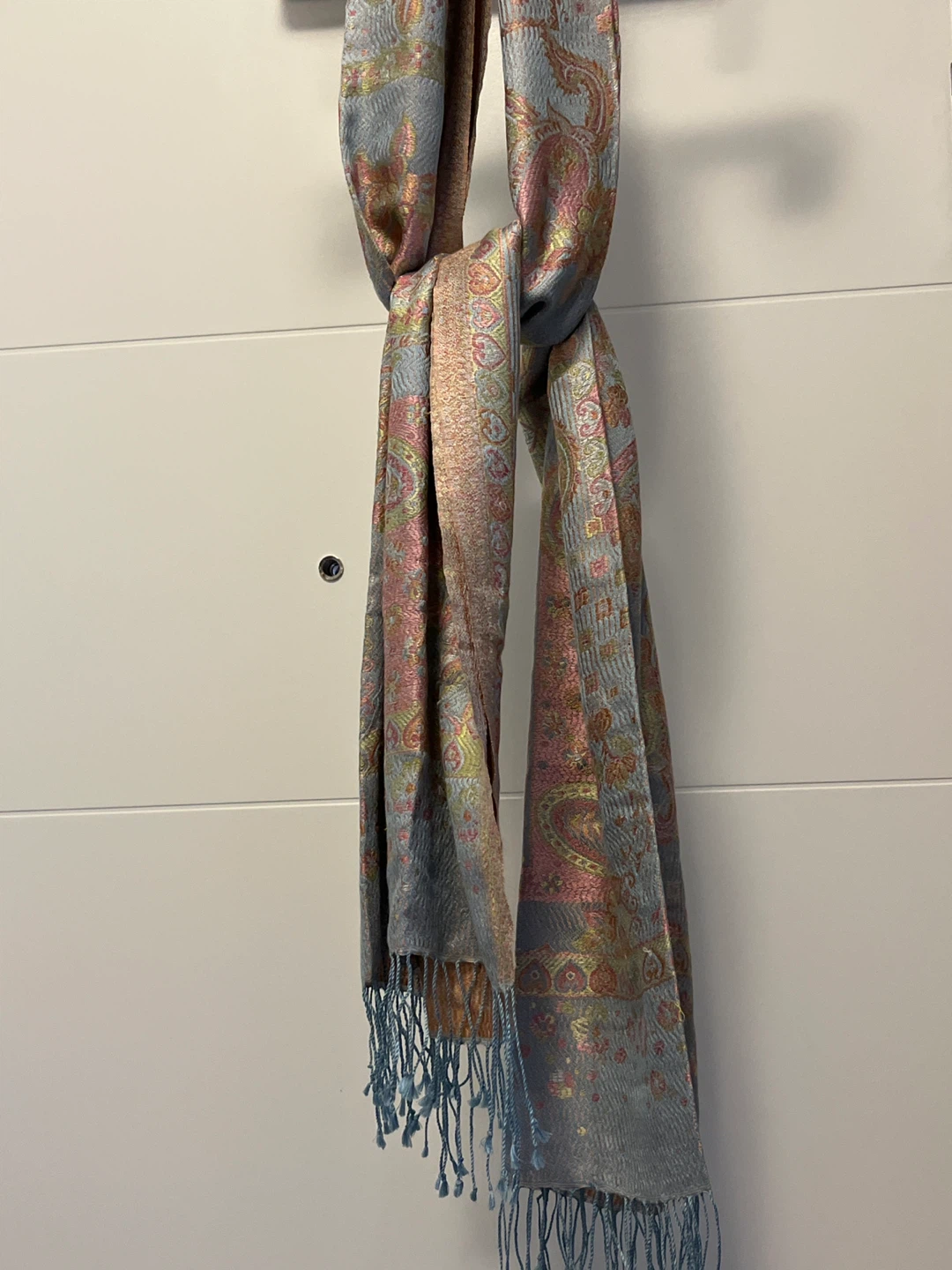 A lovely scarf featuring a paisley pattern with hints of pink, gold, and blue! It has a nice fringe at the ends. Perfect for adding a touch of elegance to any outfit