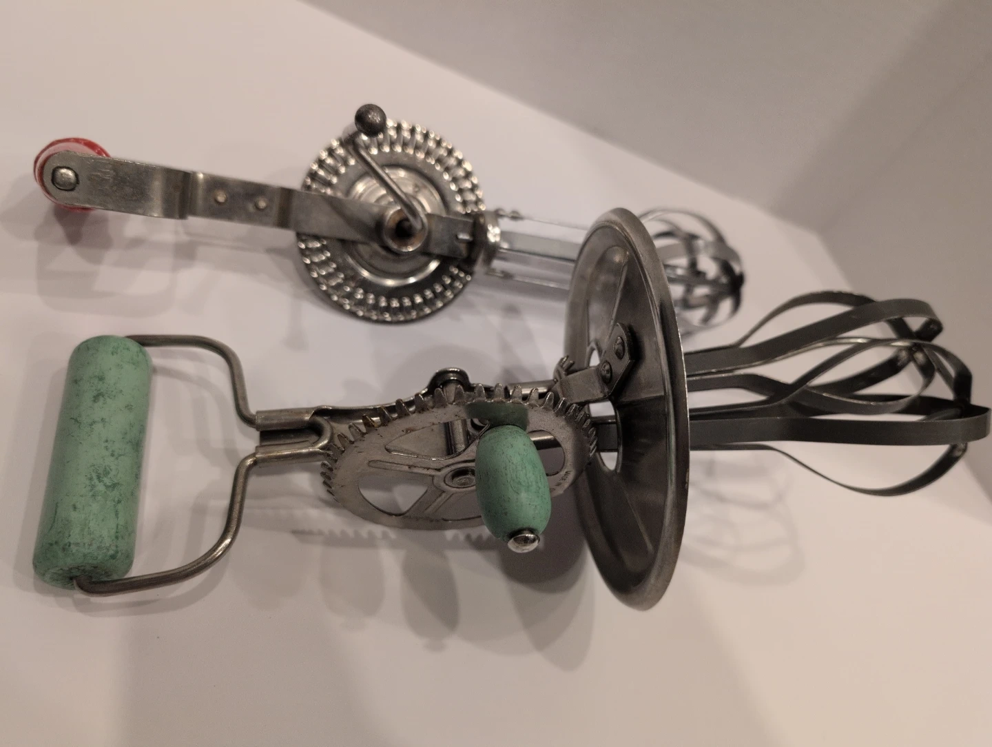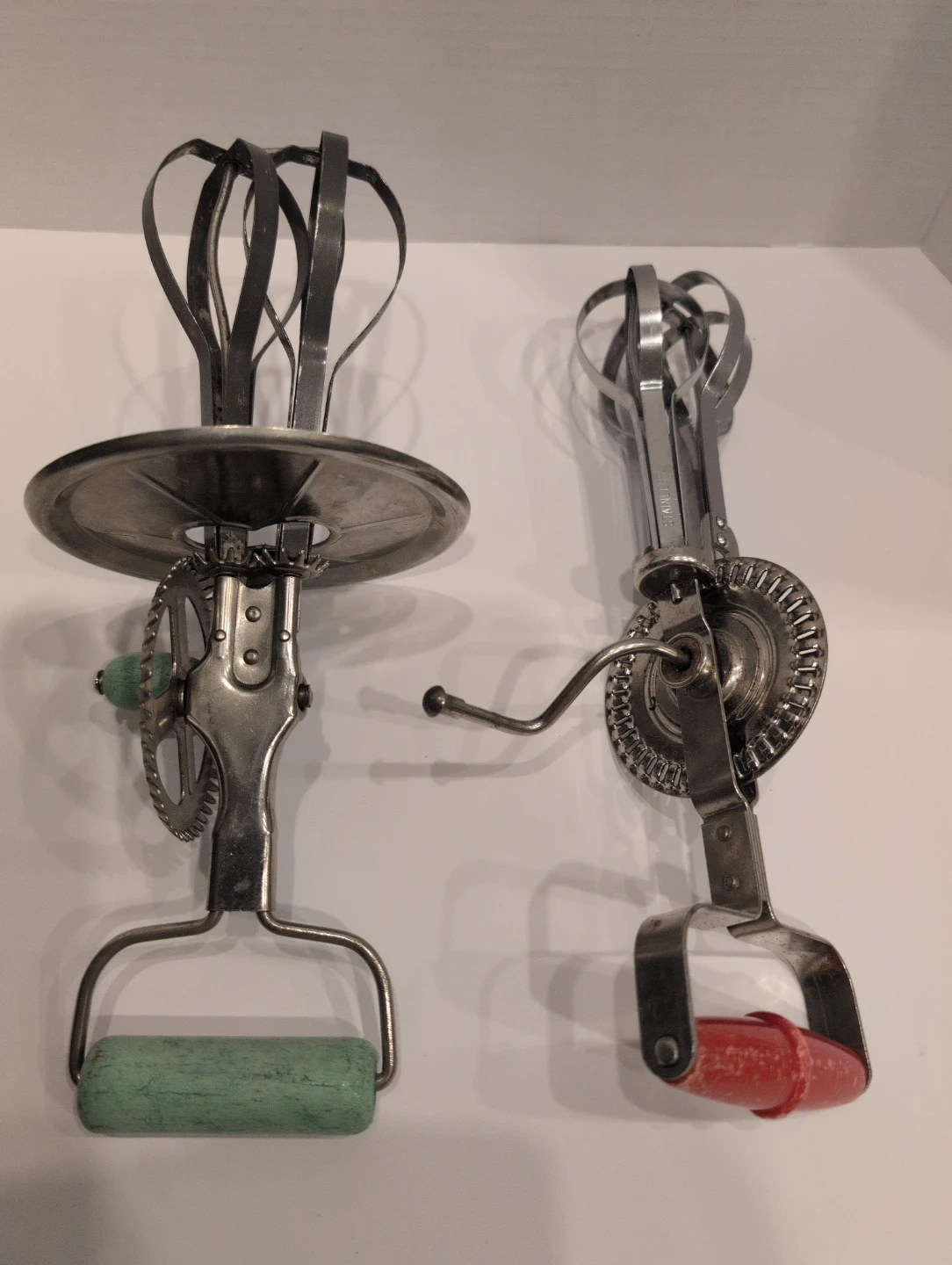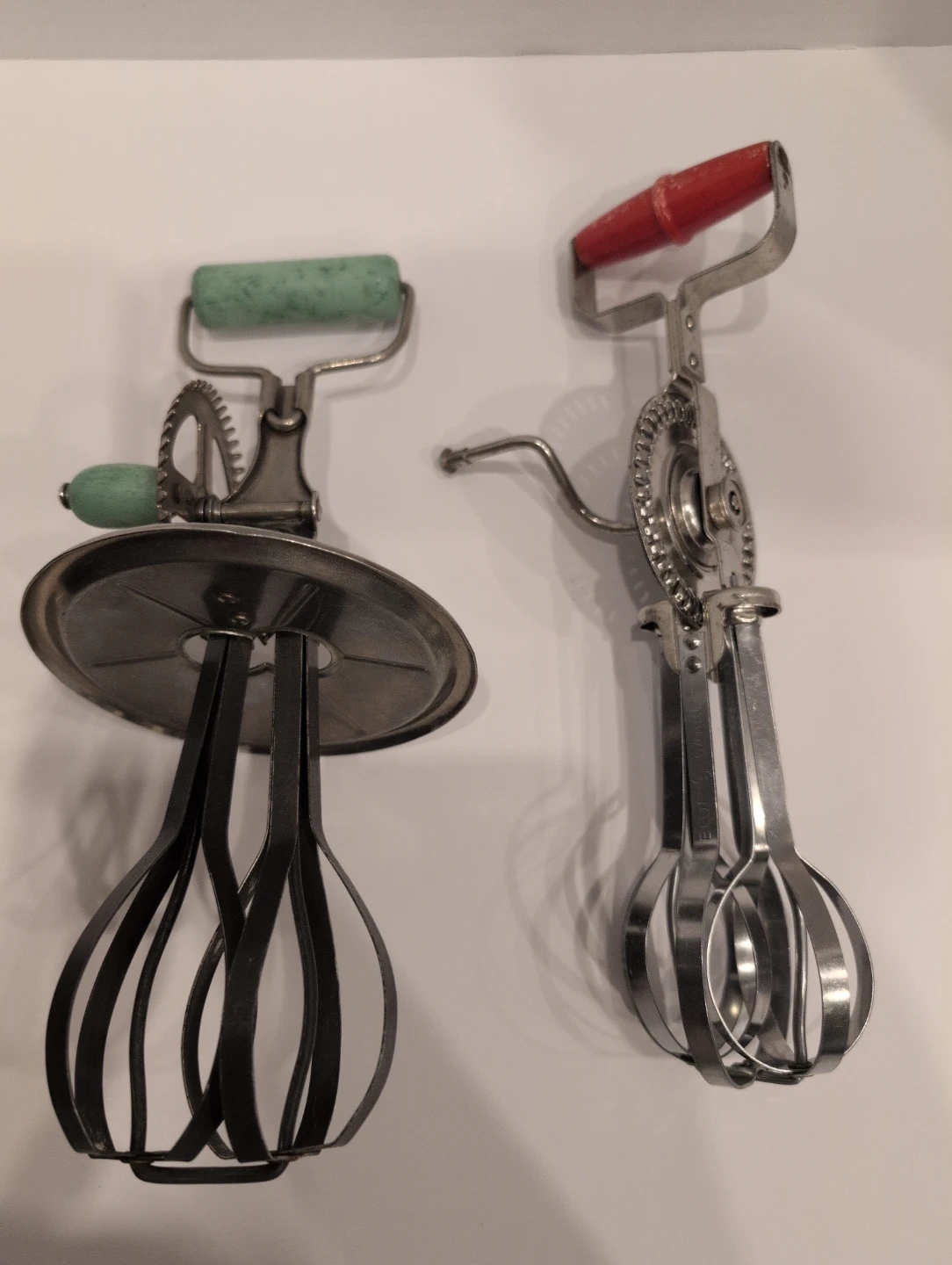 Selling two vintage hand crank egg beaters. One has wooden green handles with a spatter guard and the other has a red plastic handle. They would be a great addition to any vintage collectors kitchen!