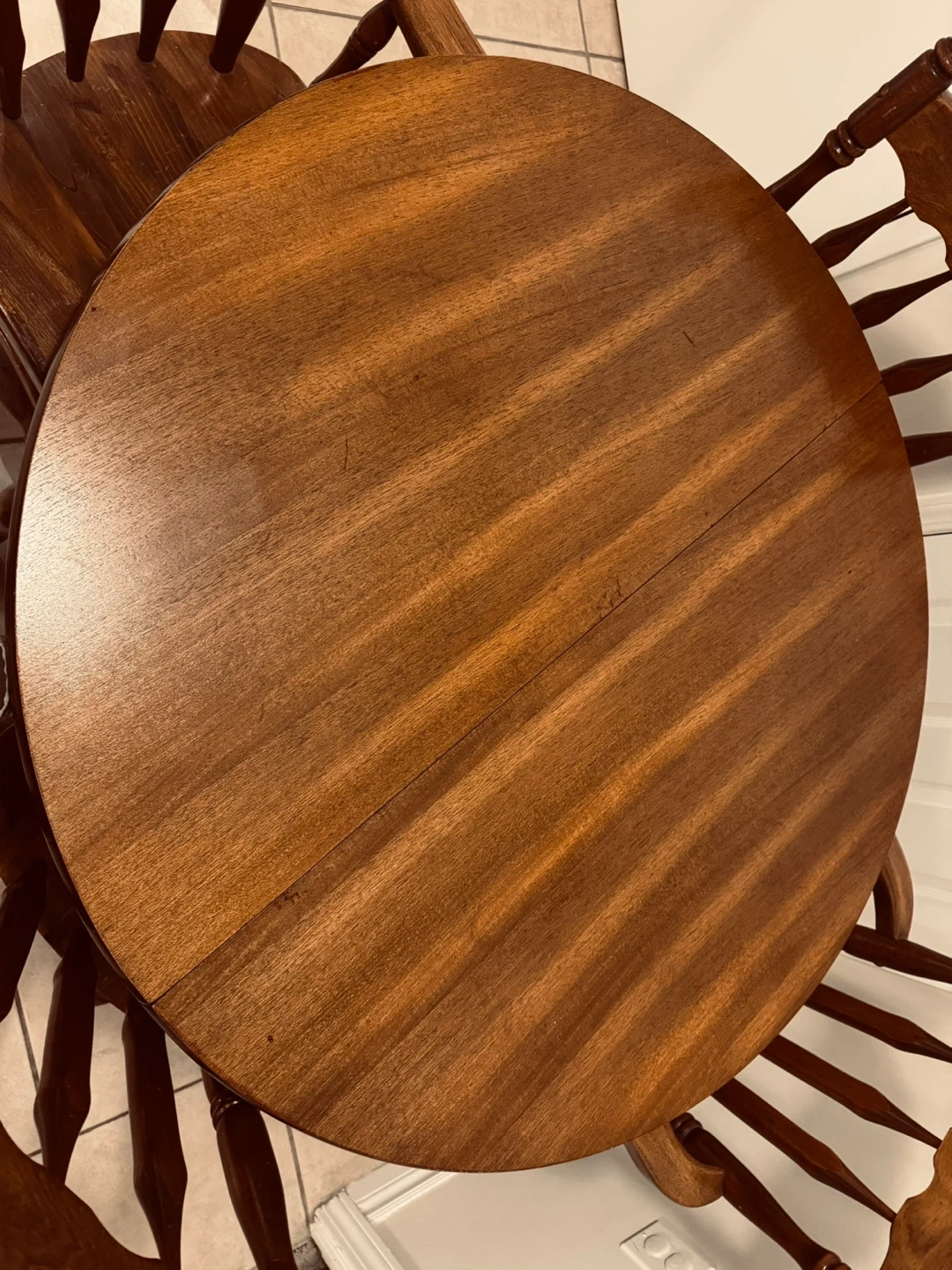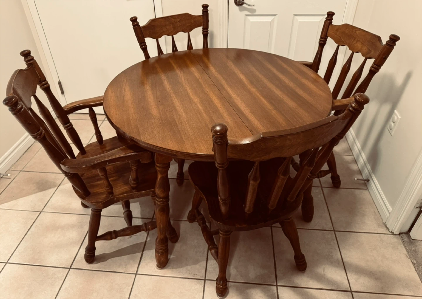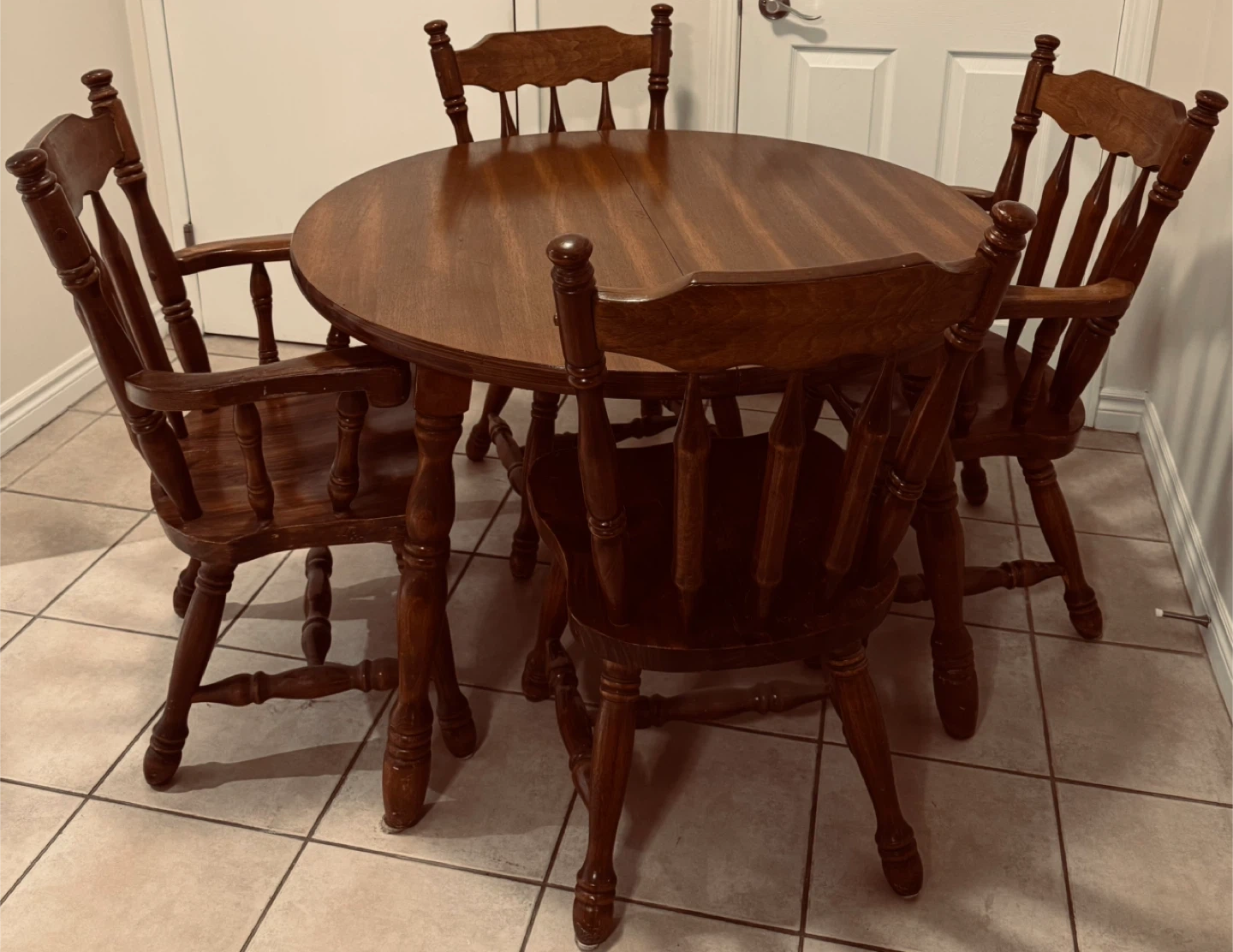 Here's a lovely wooden dining table that comes with four matching chairs. It's perfect for a smaller dining area or kitchen nook. The set has a classic design and is in good condition, ready to bring warmth to your home! The table has a round shape.