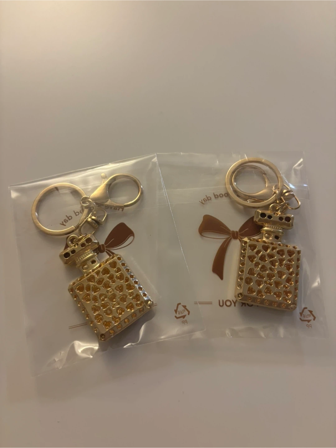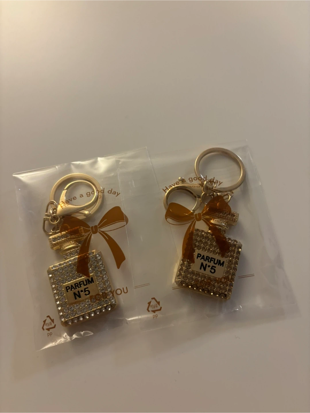 Cute Parfum N°5 bottle keychain in gold! Perfect for adding a touch of sparkle to your keys or bag. Brand new and still in the original packaging.